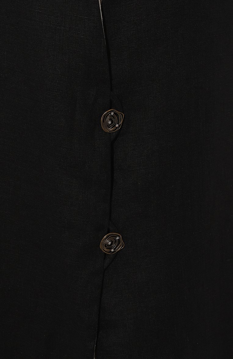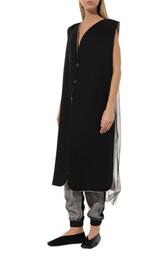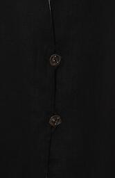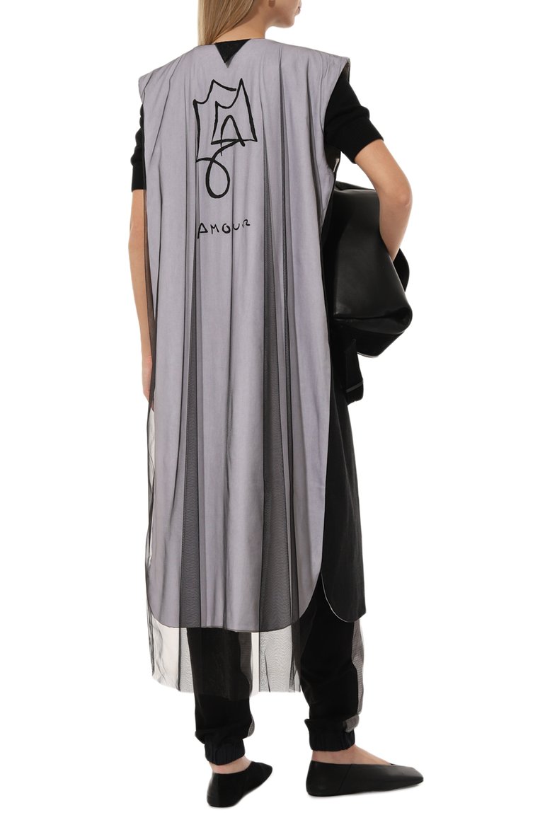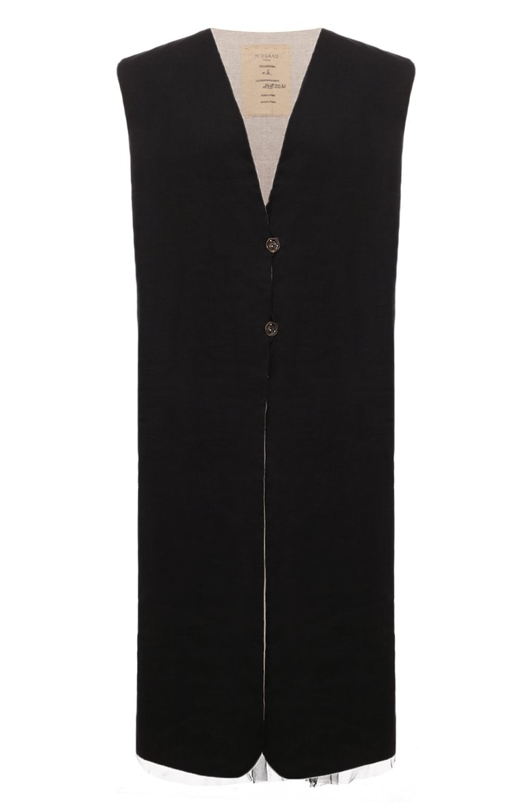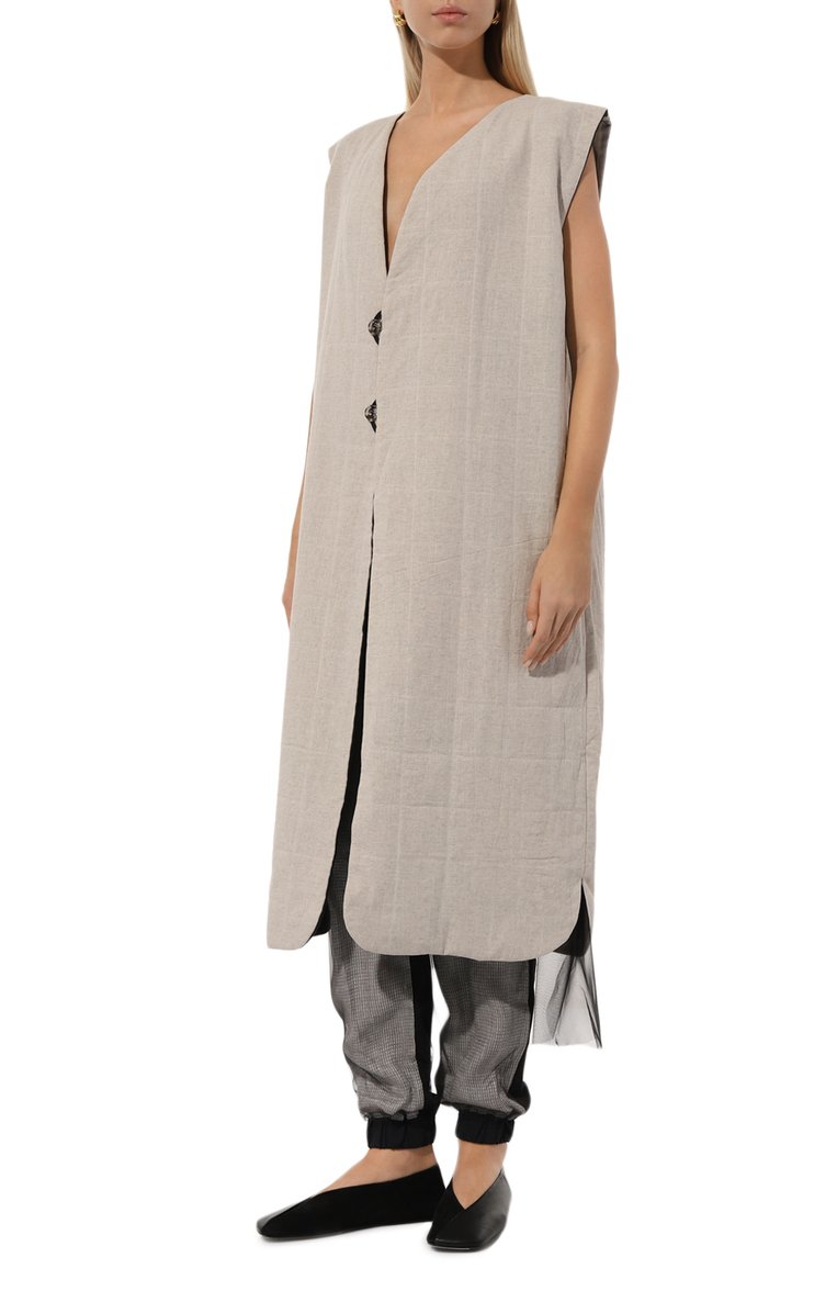 Двусторонний однобортный жилет с V-образным вырезом и закругленными краями выполнили из хлопка и льна. Спинку с крупной надписью дополнили слегка удлиненной отделкой из тюля.
