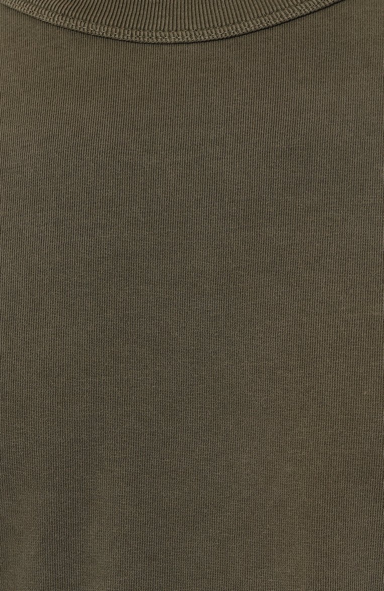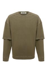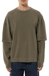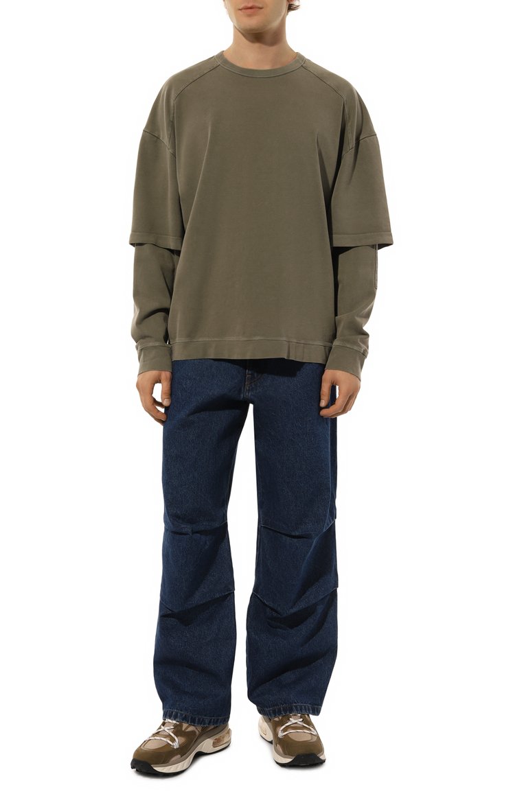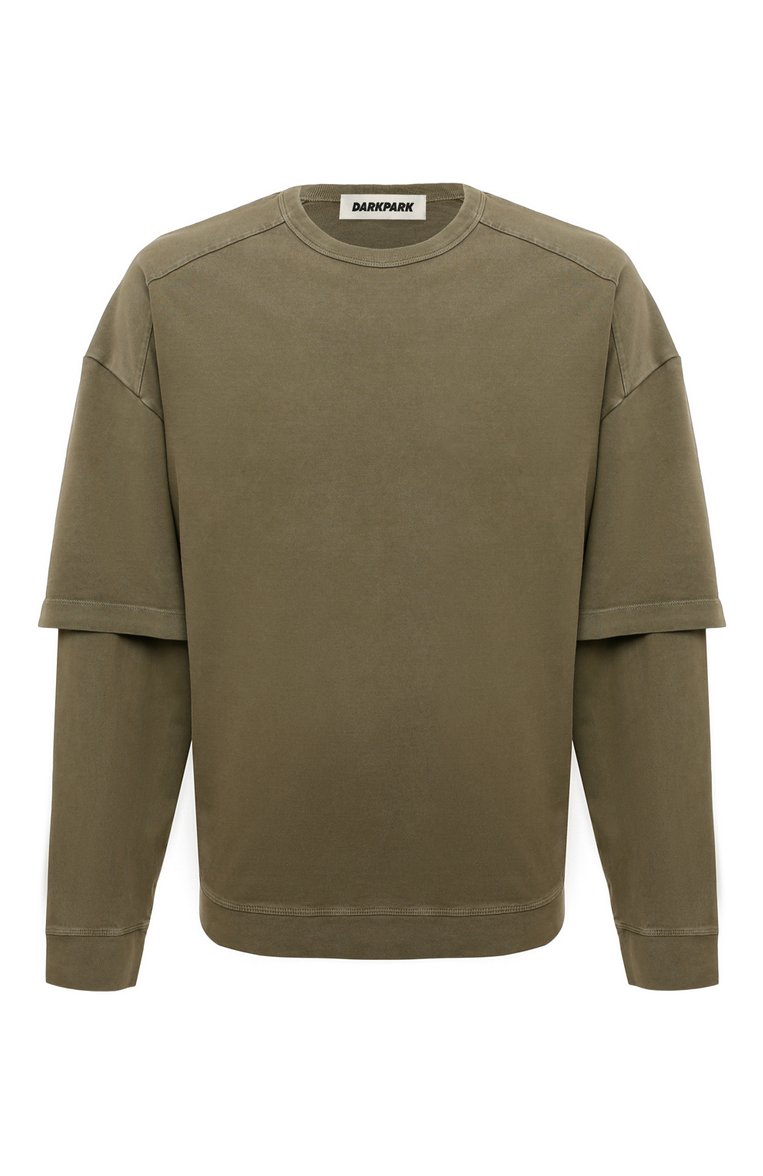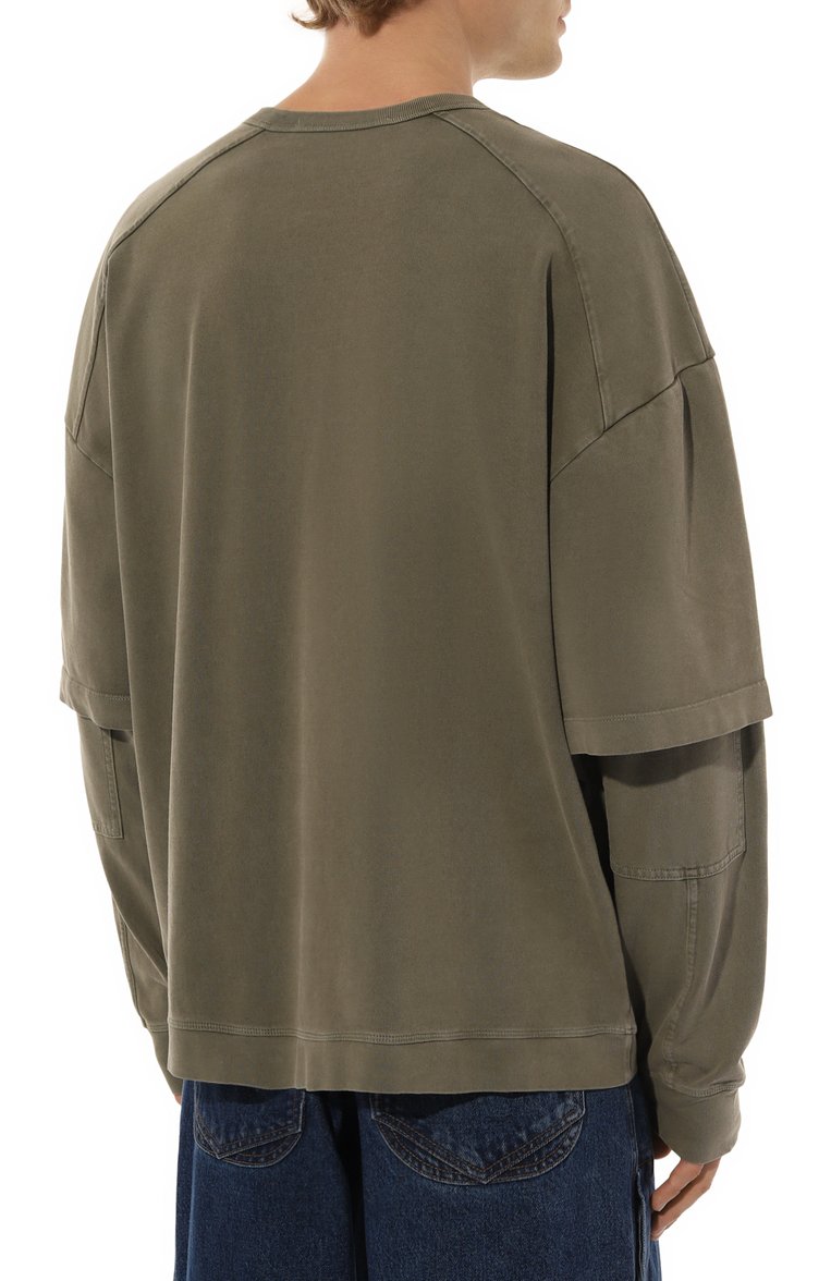 На лонгслив Theoсо спущенной линией плеч будто надели футболку из такого же из хлопкового трикотажа. Модели придали состаренный вид, неравномерно окрасив изделие и слегка осветлив швы.