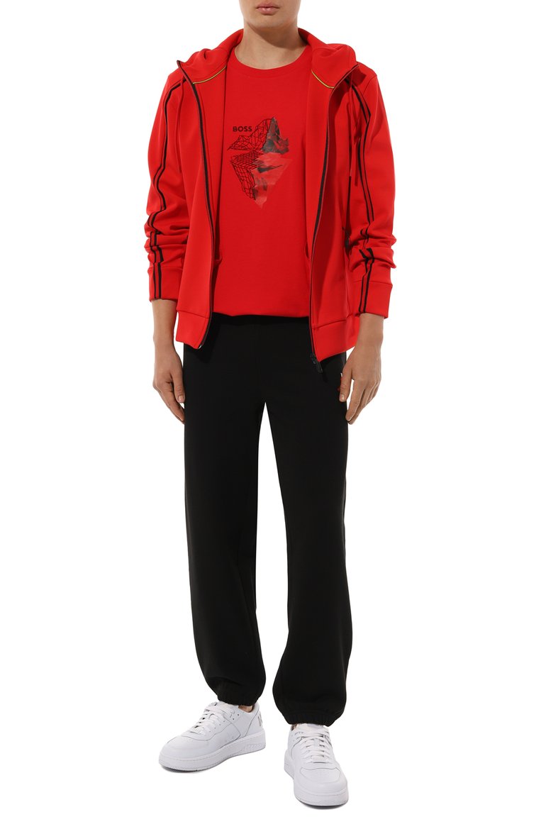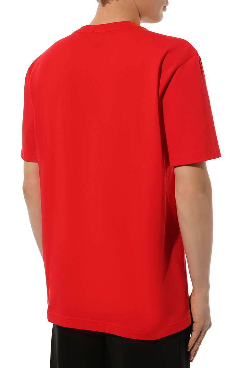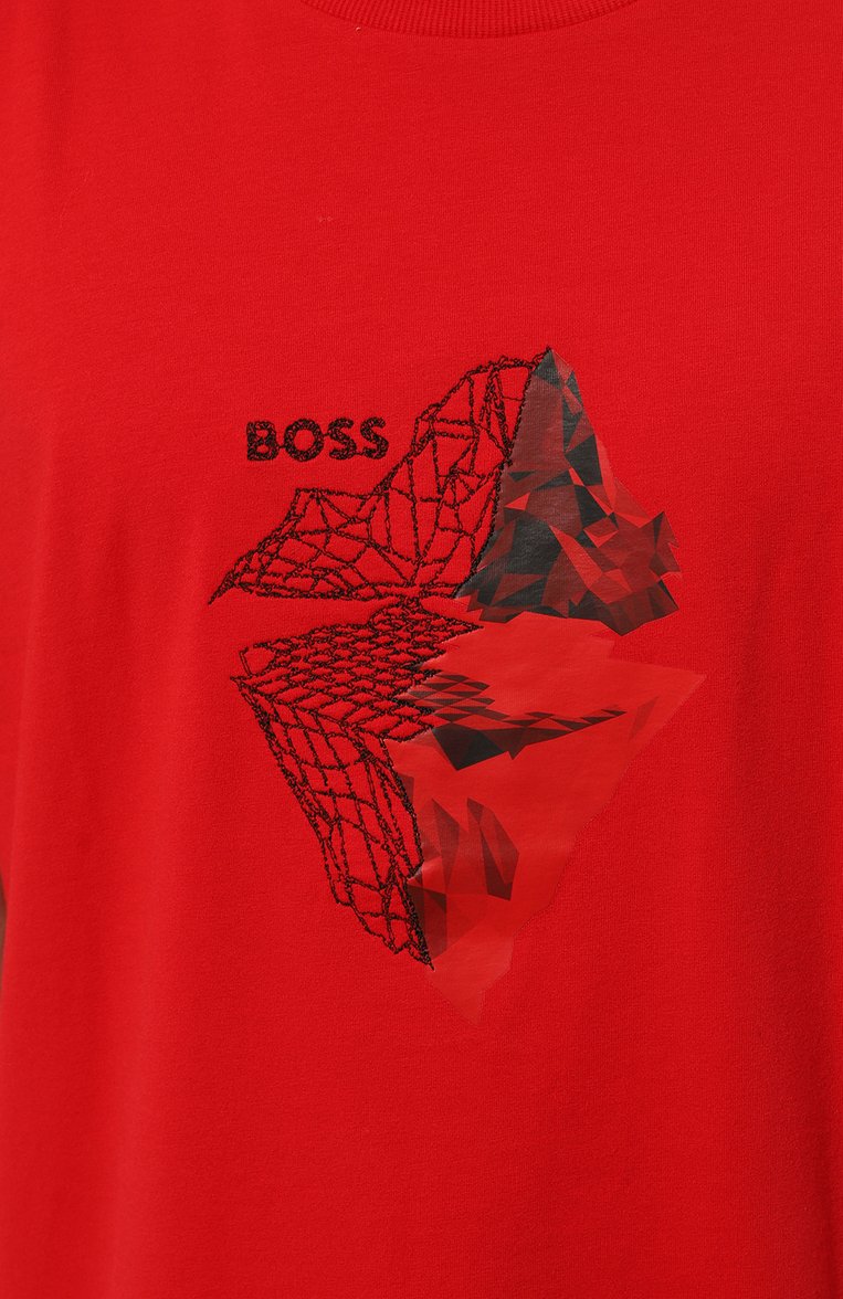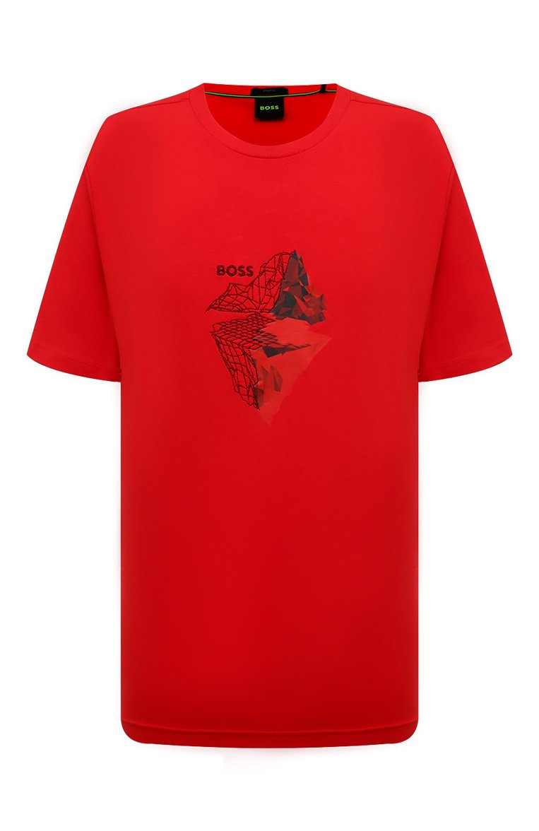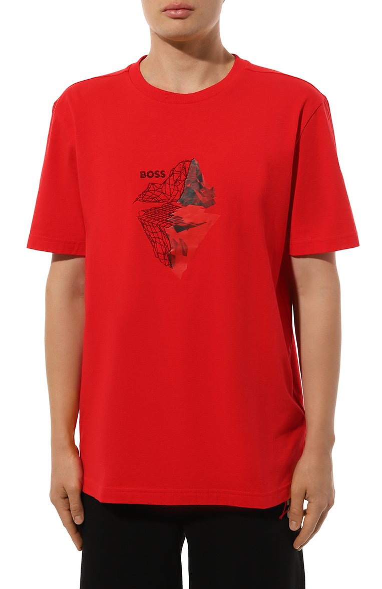 Прямую футболку из хлопкового джерси стрейч украсили фактурным принтом по мотивам 3D-графики. Изображение дополнили вышивкой и логотипом бренда.