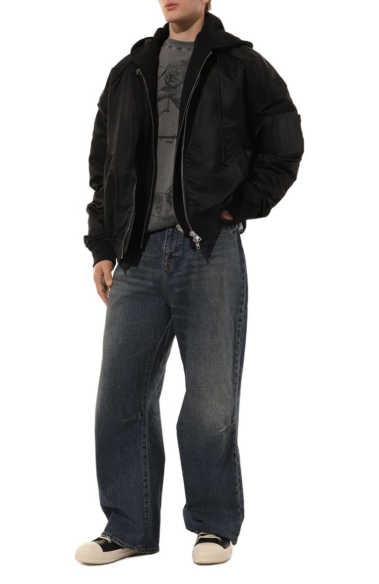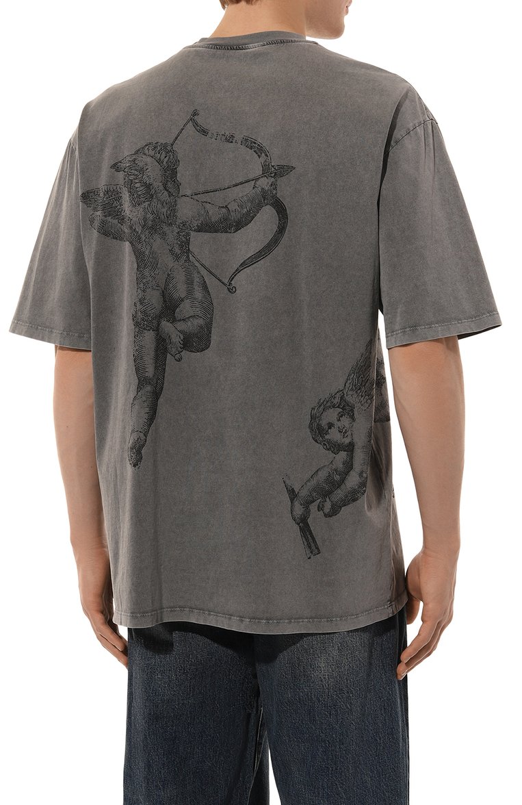 Хлопковую футболку окрасили в готовом виде так, чтобы она выглядела выцветшей со временем. Иллюзию винтажной вещи усиливают принты в виде купидонов, напоминающие старинные гравюры, и словно слегка стершаяся надпись diegoventurino bottega спереди.