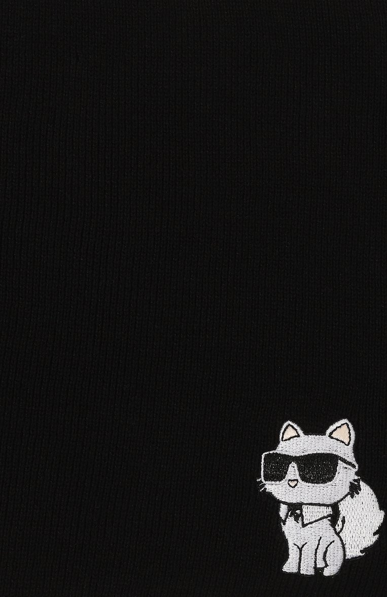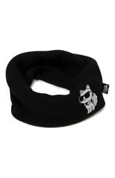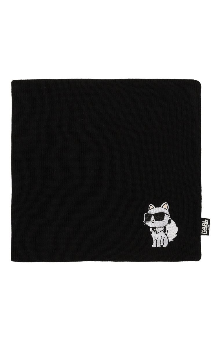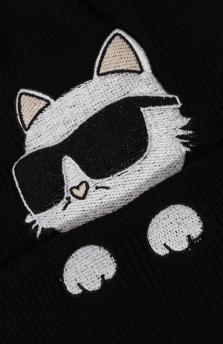 Шапку бини с широким отворотом и двухслойных снуд связали английской резинкой из хлопковой пряжи. Изделия украсили контрастными вышивками с изображениями кошки Шупетт.
