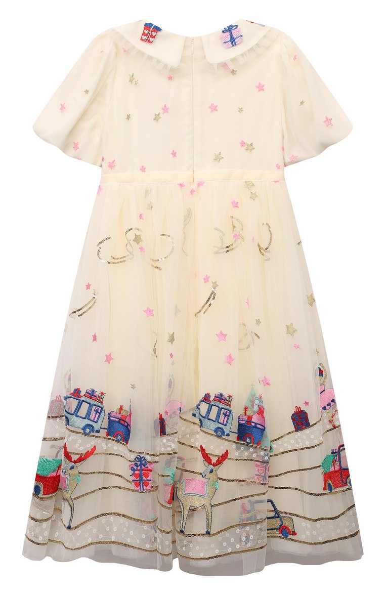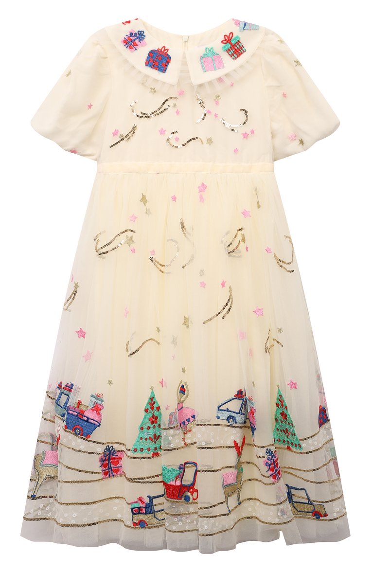 Платье с завышенной линией талии и объемными рукавами выполнили из фатина, дополнив изделие хлопковой подкладкой. Модель, украшенная новогодней вышивкой с пайетками, застегивается сзади потайной молнией.