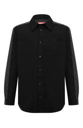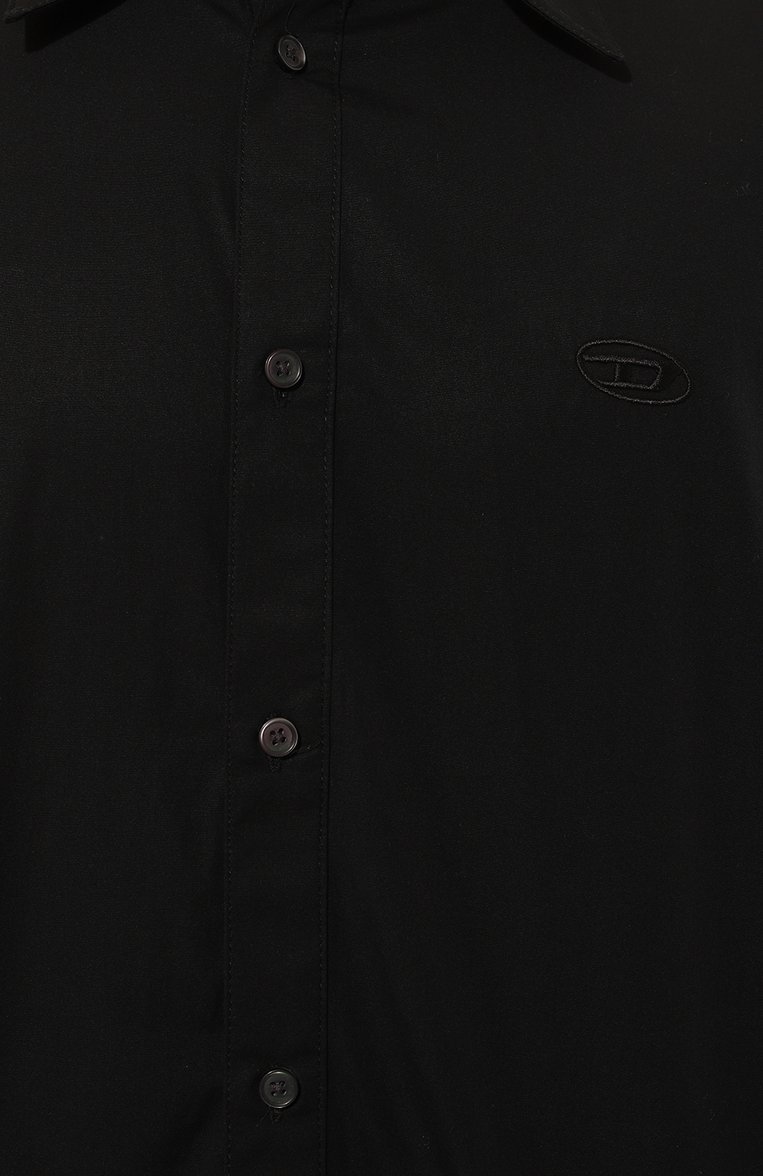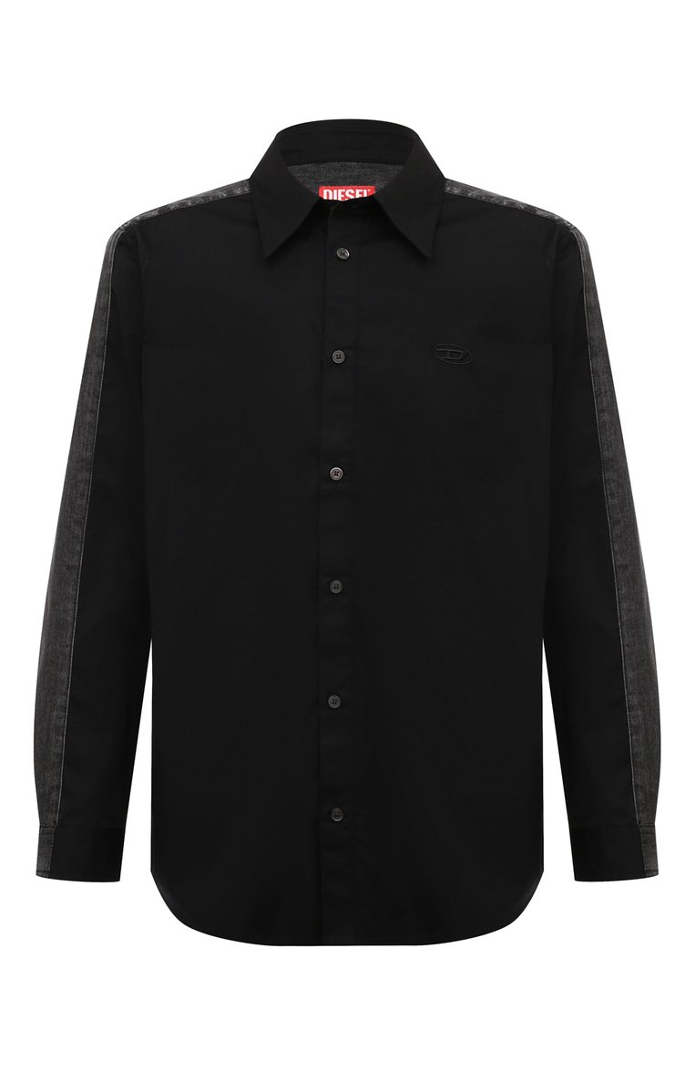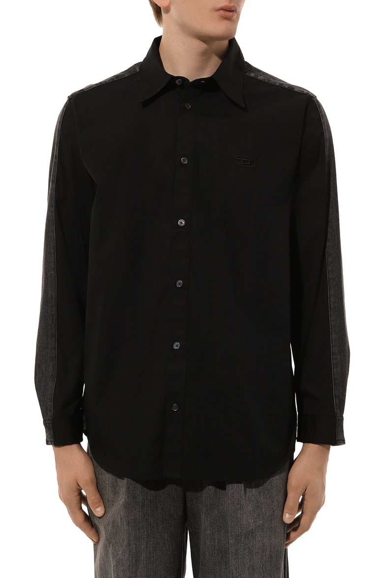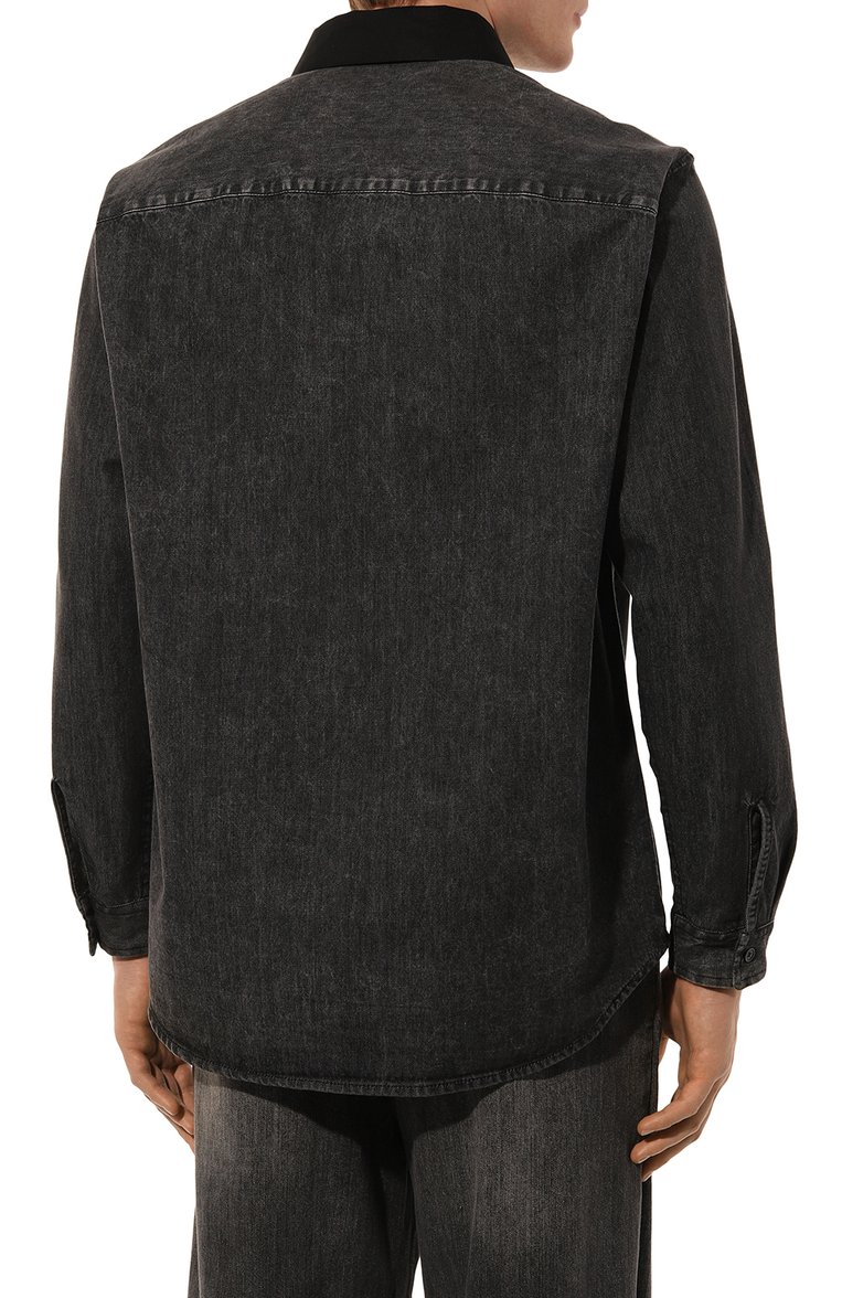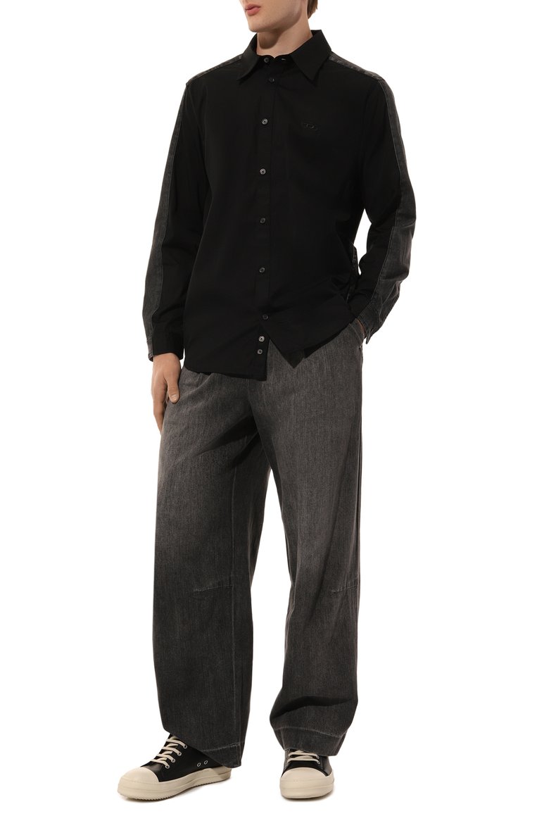 Прямую рубашку будто перешили из двух изделий: переднюю часть выполнили из поплина, а заднюю — из выбеленного денима. На груди модели разместили эмблему Oval D, вышитой нитью в тон.