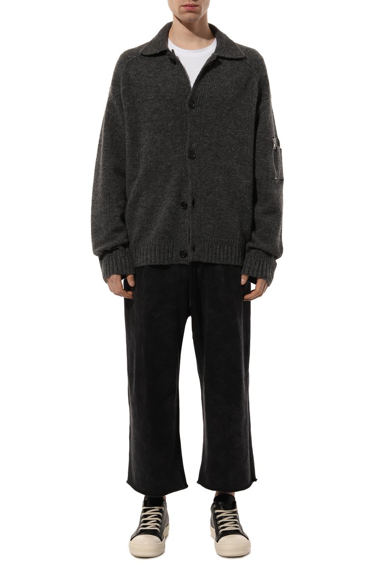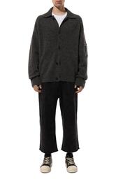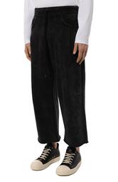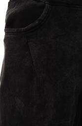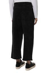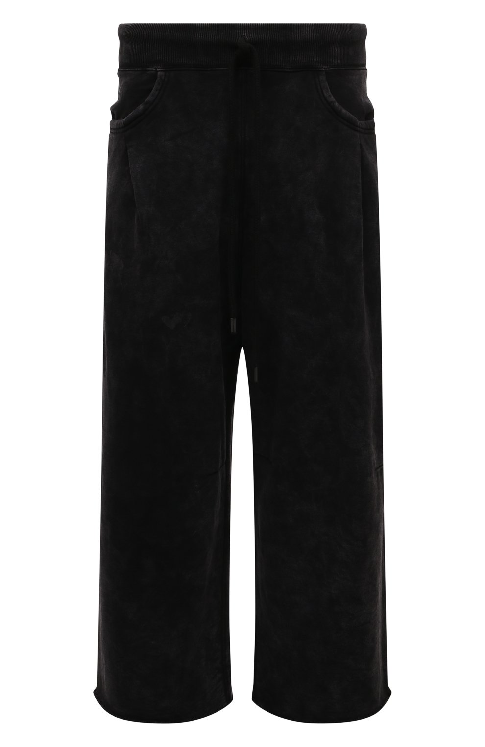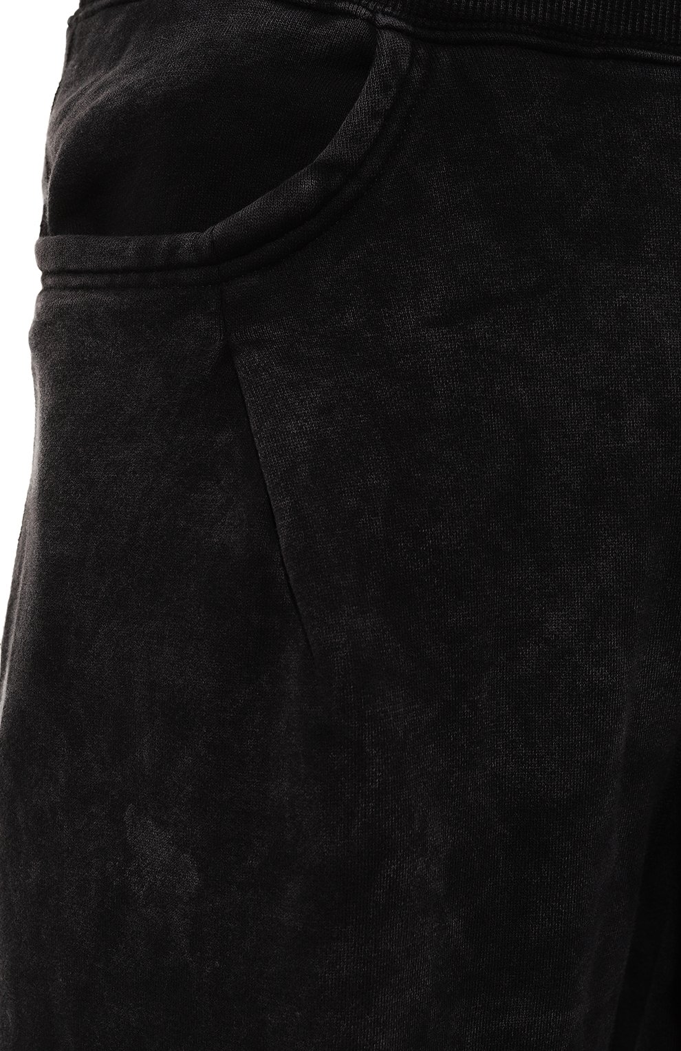 Укороченные брюки с широким эластичным поясом-кулиской, задним и двумя боковыми карманами выполнили из хлопкового трикотажа. Неравномерный цвет и необработанные края придают модели состаренный вид.
