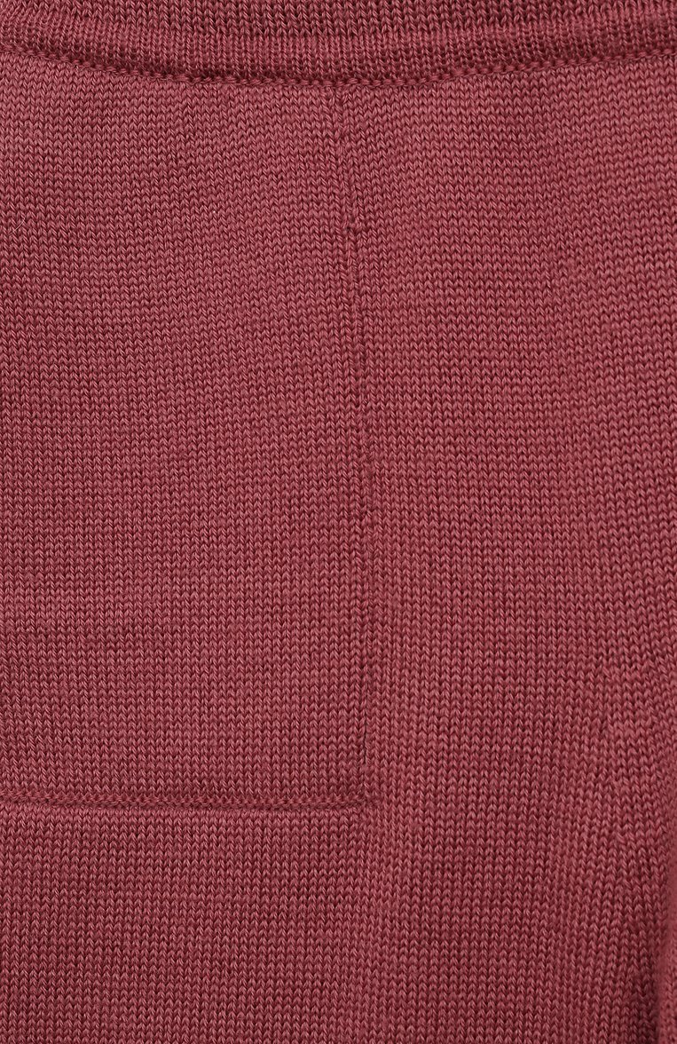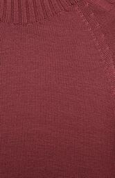 Однотонный костюм выполнили из трикотажа, связанного из мериносовой шерсти. На высокой горловине свитера можно сформировать отворот. Брюки с эластичным поясом и манжетами дополнены боковыми карманами.