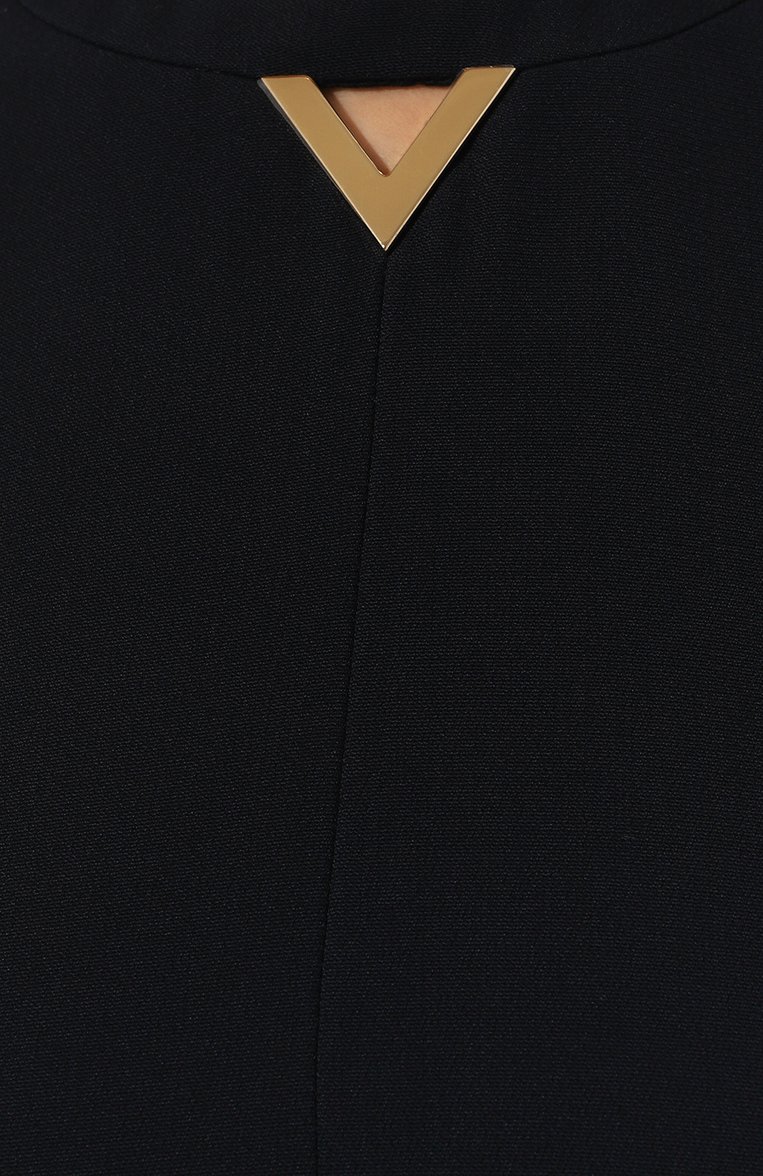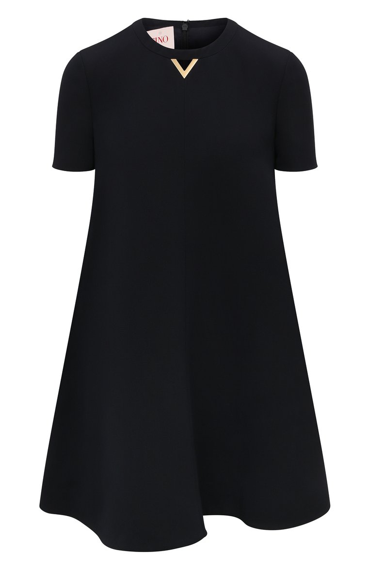 Расклешенное мини-платье из вискозной ткани Structured Couture застегивается потайной молнией на спинке. Спереди под круглой горловиной — треугольный вырез с кантом в виде золотистой литеры V.