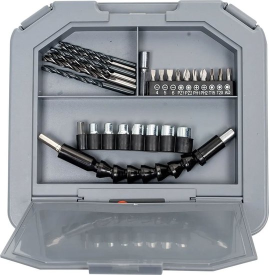 • Комплектация - кейс, - переходник (2 шт.), - головка (7 шт.), - бита (6 шт.), - сверла (6 шт.), - гибкий вал.
