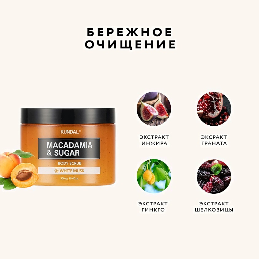 - Активные ингредиенты масло макадамии, масло ши (карите), экстракт шелковицы, косточки абрикоса, экстракт инжира, экстракт граната, экстракт гинкго билоба