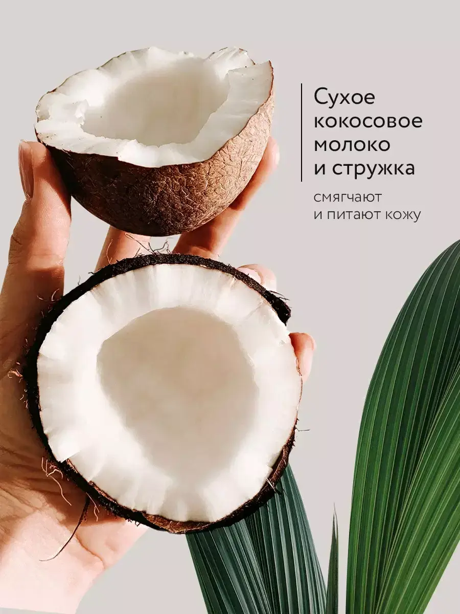 • Активные ингредиенты соль (гималайская, морская), кокосовая стружка, масло кокоса, молоко кокосовое, масло миндаля, пантенол