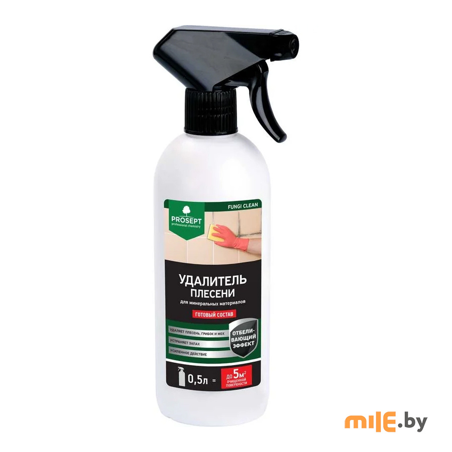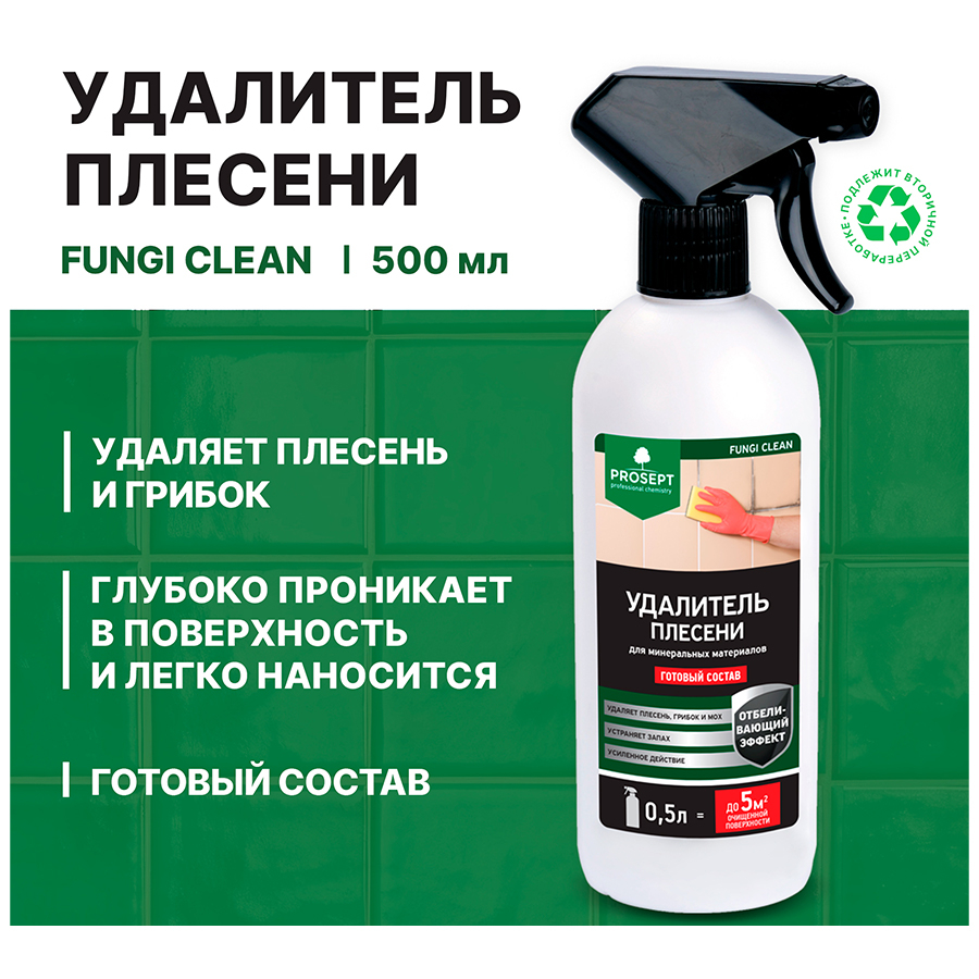 PROSEPT FUNGI CLEAN – эффективное средство для удаления плесени, грибка, мха, водорослей, слизистых, мыльных и других глубоко въевшихся загрязнений с керамической плитки и стыков, обоев, пластика, дерева, бетона, гипсокартона, крашеных поверхностей, искусственного и натурального камня, цоколя, бордюров, памятников и т. п.