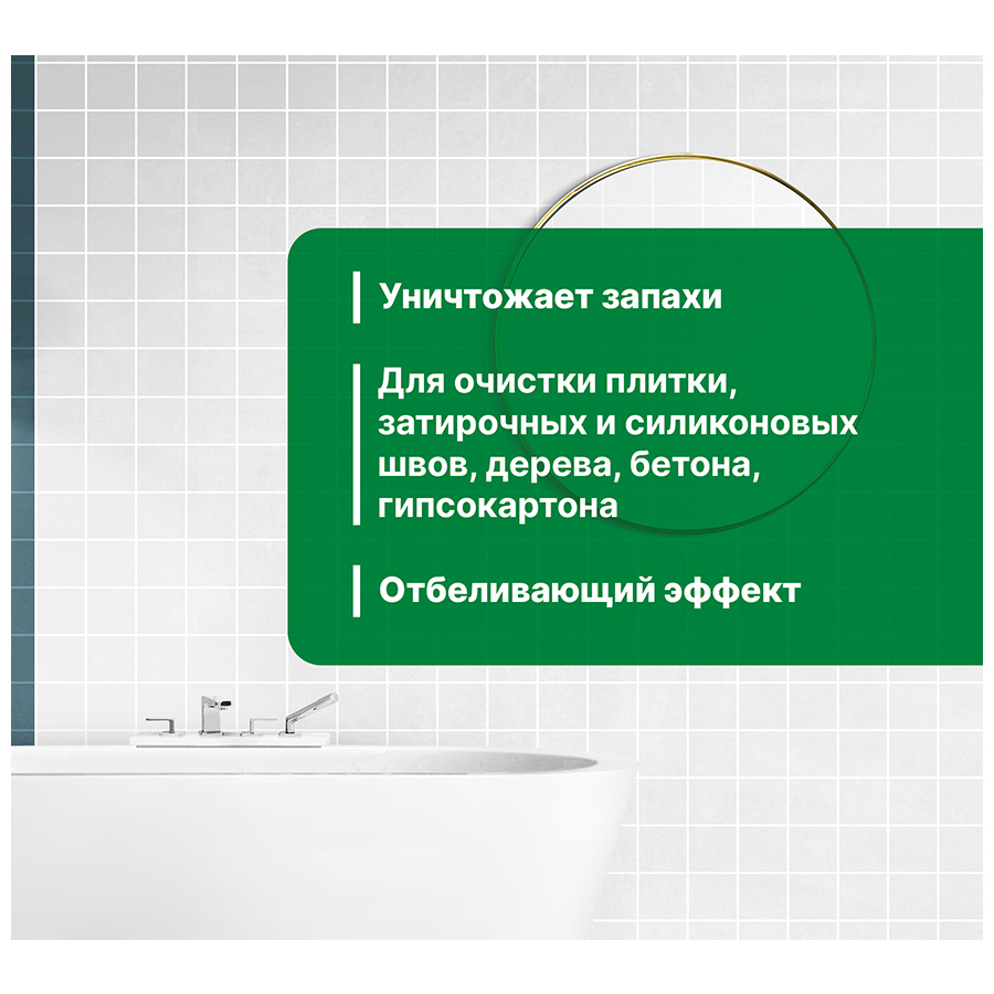 Обладает дезинфицирующим эффектом, блокирует развитие плесени и микроорганизмов, удаляет запахи. Применяется для очистки внутренних и наружных стен зданий, ванных комнат, душевых кабин, эффективно очищает деревянные поверхности в банях и саунах, удаляет плесень и запахи в подвальных помещениях.
