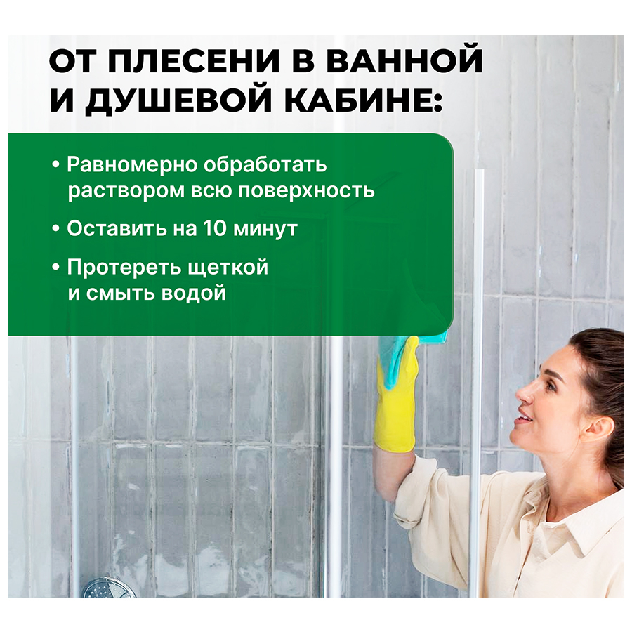 3. Чистка кафеля, душевых кабин : нанести на поверхность, дать подействовать несколько часов. Промыть водой.