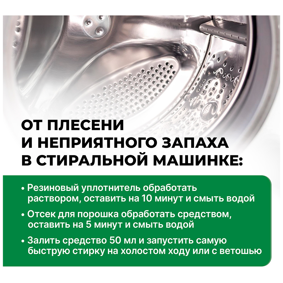 1. Удаление плесени : нанести на поверхность, дать подействовать несколько часов. Промыть водой либо протереть мокрой губкой.