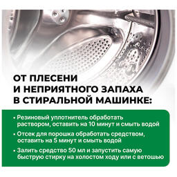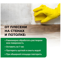 Меры предосторожности : При работе с удалителем плесени использовать индивидуальные средства защиты: очки, перчатки. При попадании раствора на кожу или в глаза промыть большим количеством воды, при необходимости обратиться к врачу. В закрытых помещениях рекомендуется обеспечить вентиляцию и, по возможности, максимально сократить время пребывания в помещении. Беречь от детей!