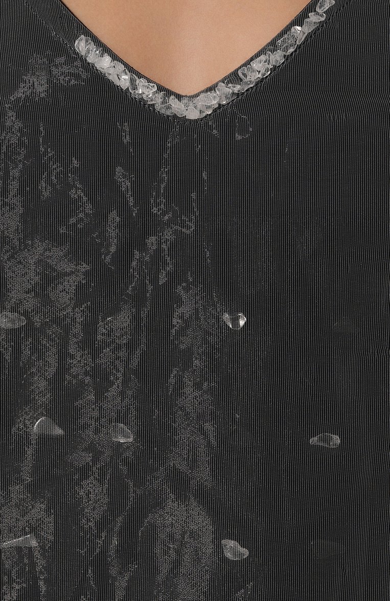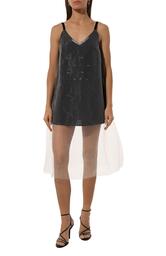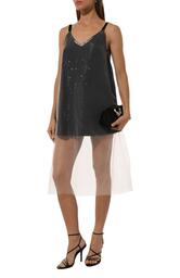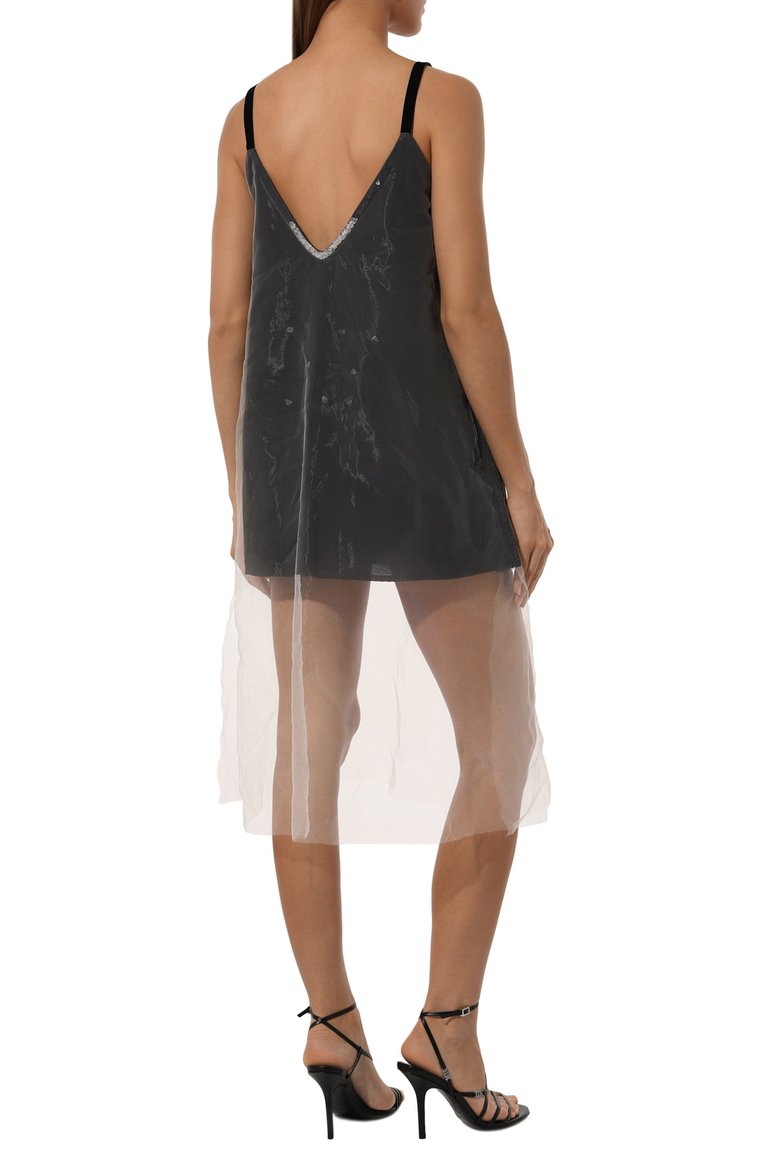 Платье A-силуэта выполнили из плотной ткани и дополнили верхним слоем из почти прозрачной сетки. Глубокое V-образное декольте и вырез сзади подчеркнули россыпью камней, которой вторит декор на спинке и линии талии.