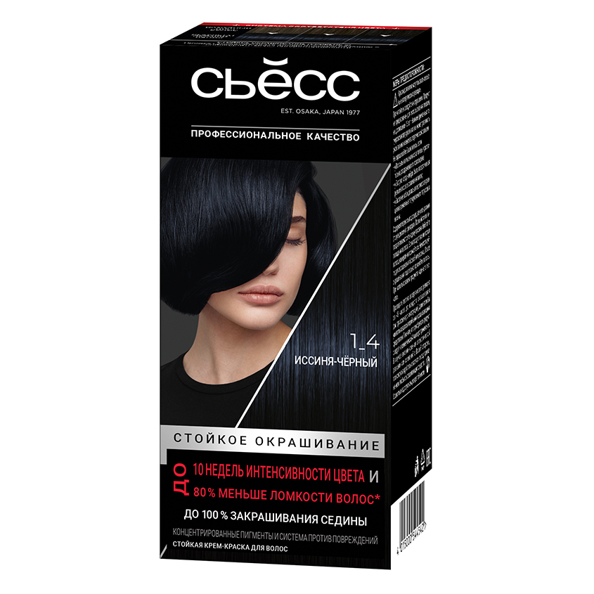 Стойкая крем-краска для волос СЬЁСС Иссиня-чёрный 1_4 с концентрированными цветовыми пигментами и системой против повреждений. Пигменты красителя глубоко проникают в волокна волоса, позволяя добиться ИНТЕНСИВНОСТИ ЦВЕТА ДО 10 НЕДЕЛЬ и ПРОФЕССИОНАЛЬНОГО ЗАКРАШИВАНИЯ СЕДИНЫ. Ухаживающая технология SALONPLEX реставрирует повреждённые связи в структуре волоса и восстанавливает волосы изнутри. Формула с кератином покрывает кутикулу волос, делая их более мягкими и гладкими. Для ВИЗУАЛЬНО УЛУЧШЕННОГО КАЧЕСТВА ВОЛОС* и ДО 80 % МЕНЬШЕ ЛОМКОСТИ ВОЛОС*. Подходит для волос от каштановых до чёрных оттенков. Для волос с любым содержанием седины. Стойкое окрашивание.