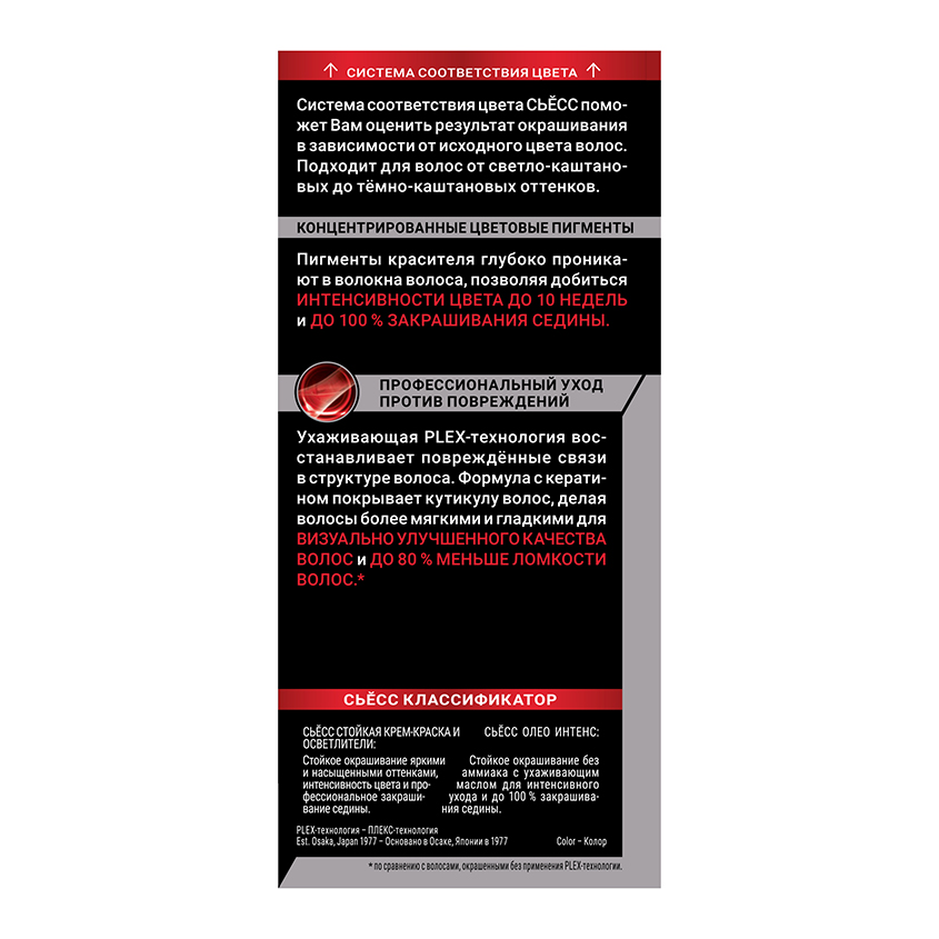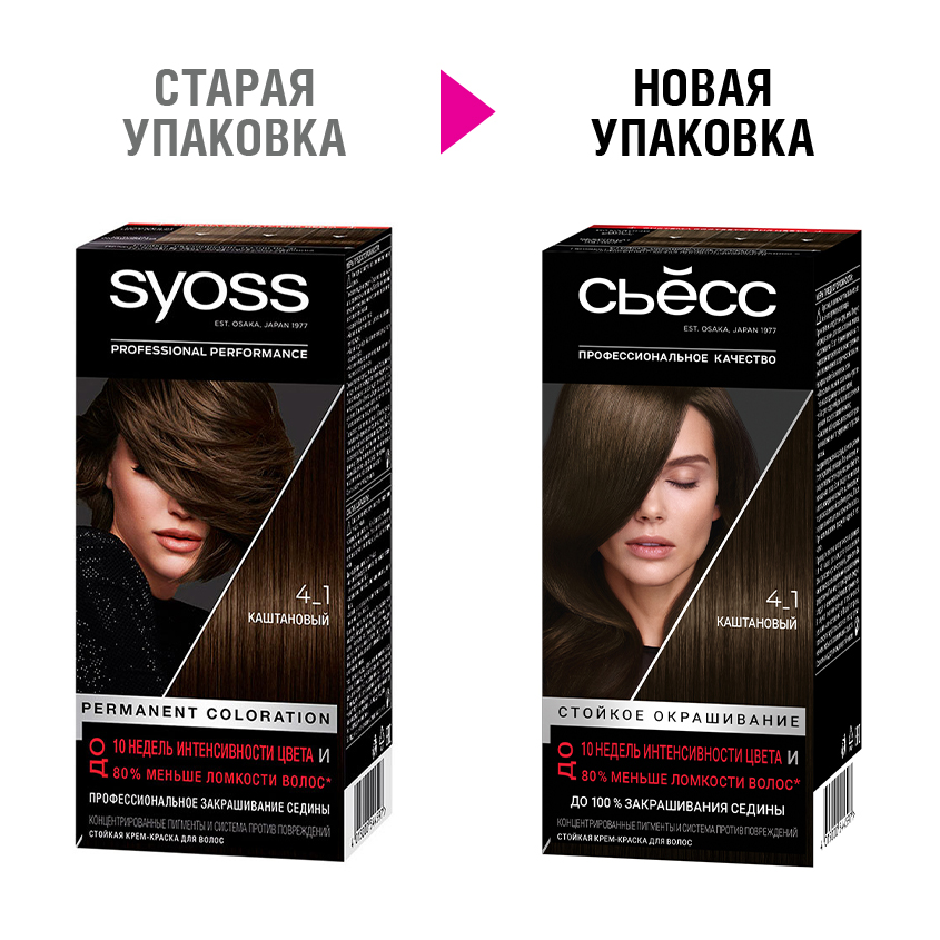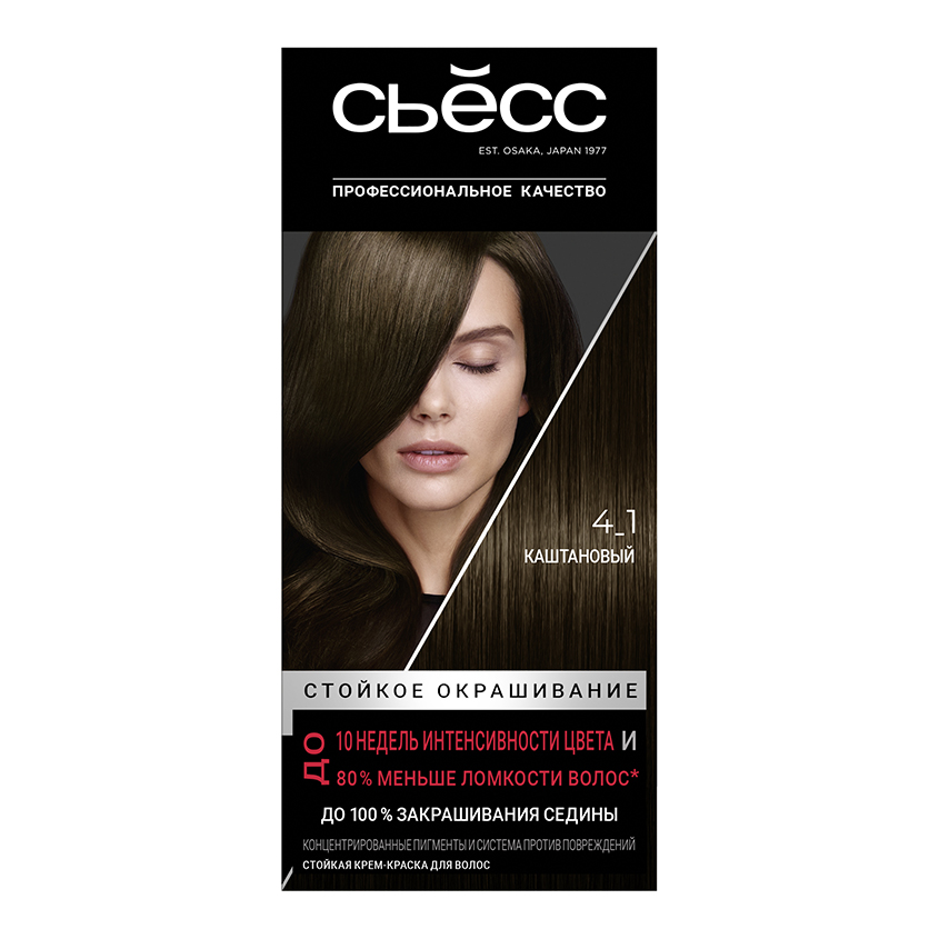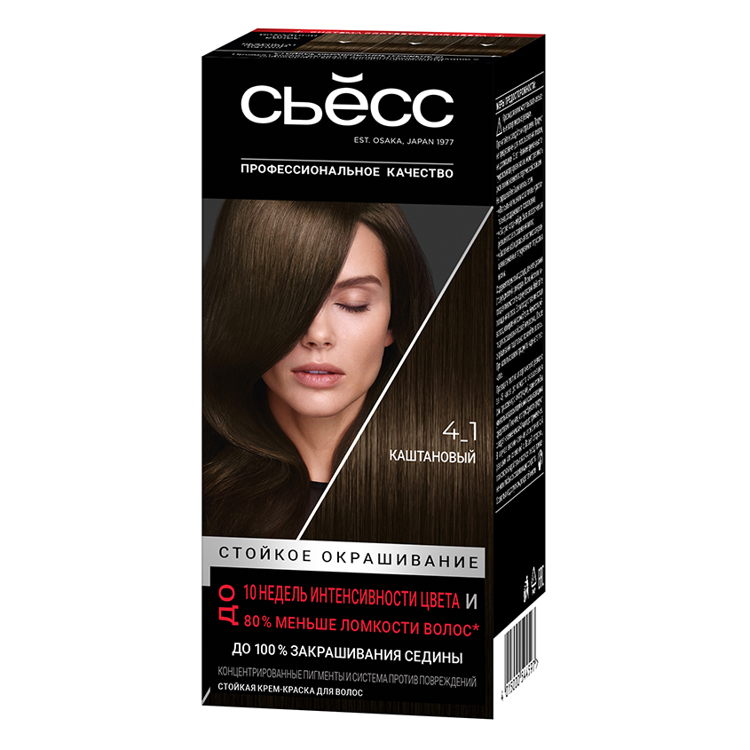 Стойкая крем-краска для волос СЬЁСС Каштановый 4_1 с концентрированными цветовыми пигментами и системой против повреждений. Пигменты красителя глубоко проникают в волокна волоса, позволяя добиться ИНТЕНСИВНОСТИ ЦВЕТА ДО 10 НЕДЕЛЬ и ПРОФЕССИОНАЛЬНОГО ЗАКРАШИВАНИЯ СЕДИНЫ. Ухаживающая технология SALONPLEX реставрирует повреждённые связи в структуре волоса и восстанавливает волосы изнутри. Формула с кератином покрывает кутикулу волос, делая их более мягкими и гладкими. Для ВИЗУАЛЬНО УЛУЧШЕННОГО КАЧЕСТВА ВОЛОС* и ДО 80 % МЕНЬШЕ ЛОМКОСТИ ВОЛОС*. Подходит для волос от светло-каштановых до тёмно-каштановых оттенков. Для волос с любым содержанием седины. Стойкое окрашивание.