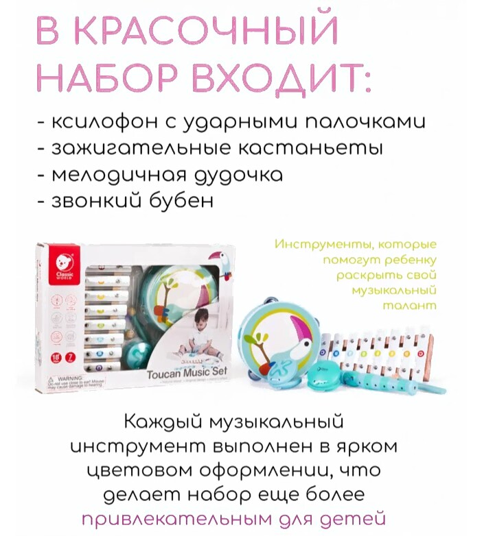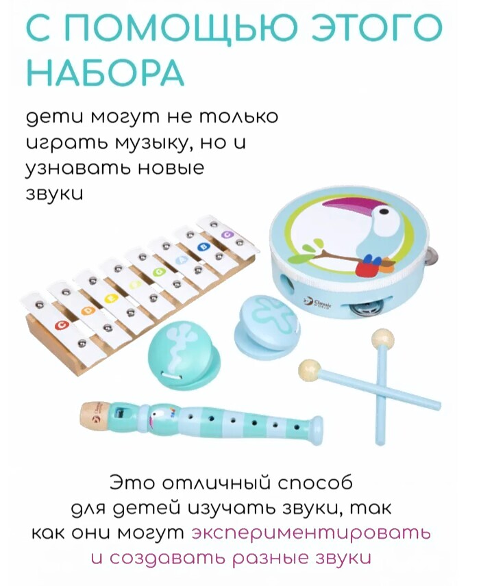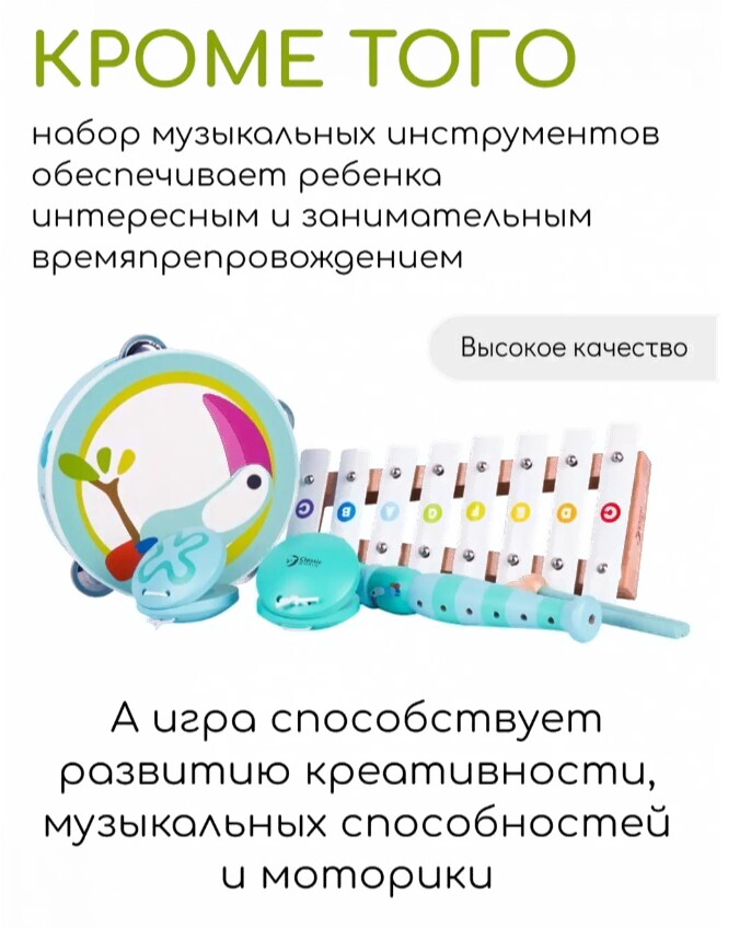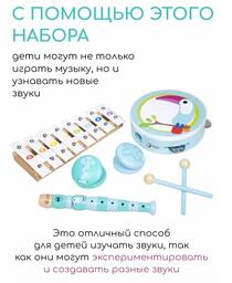 • Музыкальные инструменты в наборе бубен, ксилофон, дудочка, кастаньета