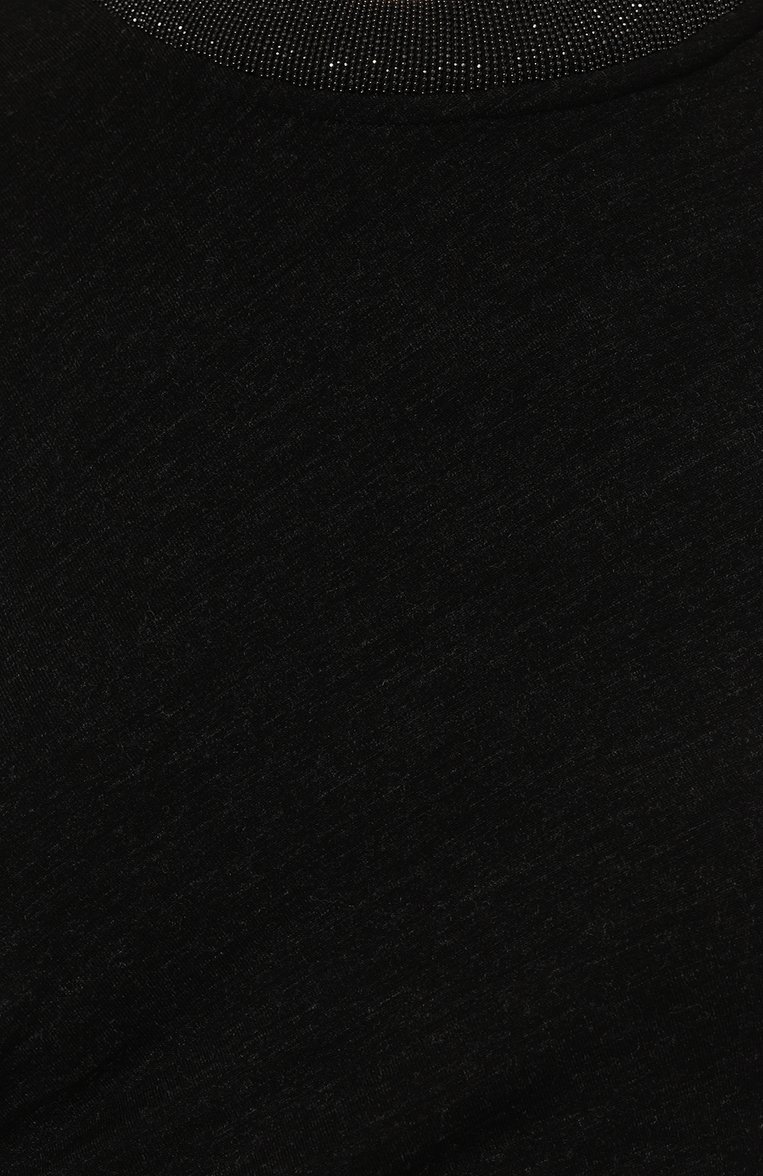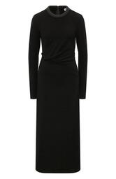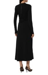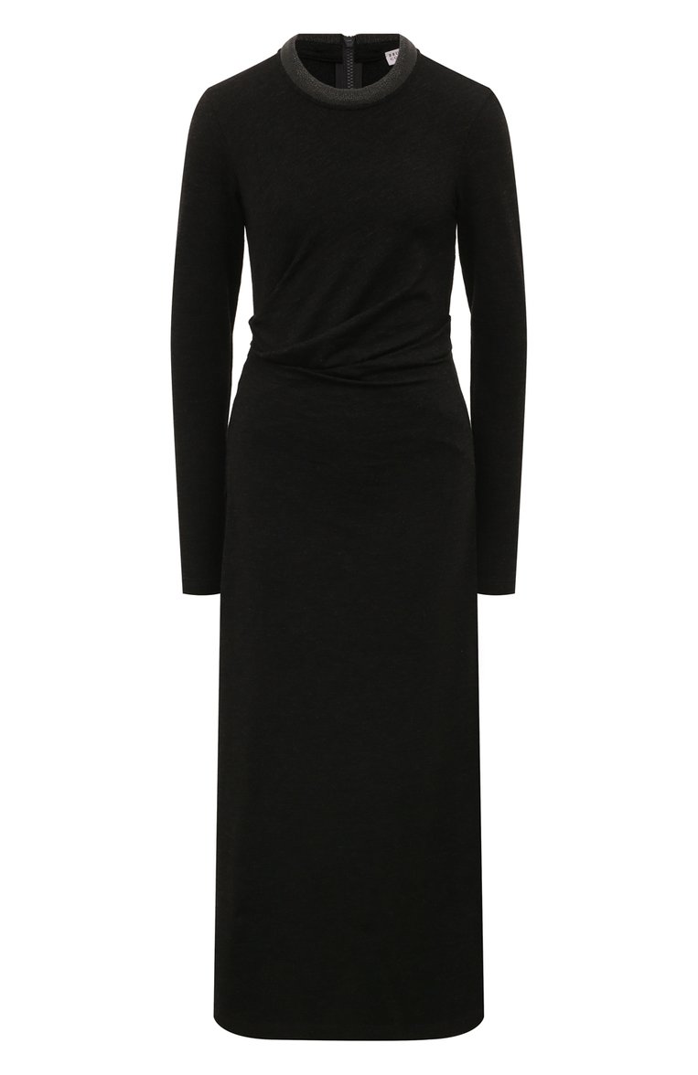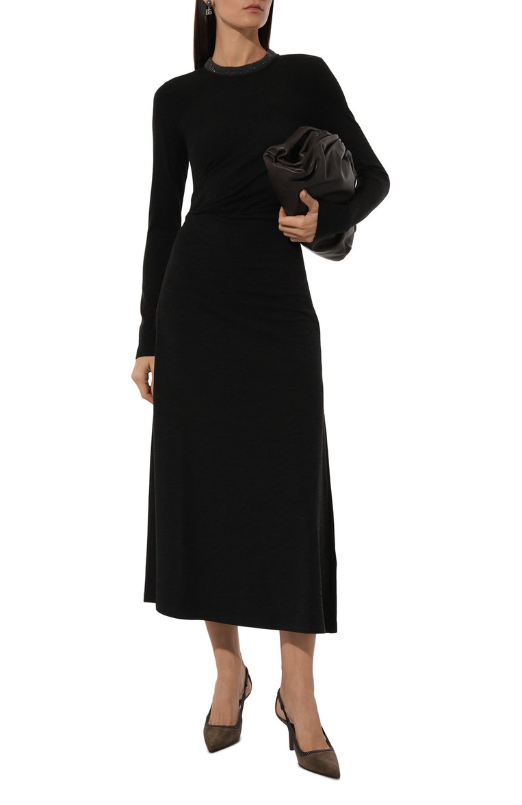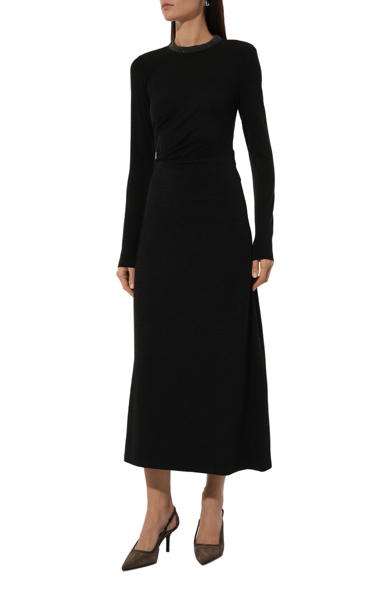 Платье длиной до середины голени выполнили из трикотажа стрейч на основе шерсти первого пострига. Горловину подчеркнули кантом из цепочек мониль, знаковых для марки. Модель с высоким разрезом на подоле справа застегивается молниями на спинке и в левом боковом шве.
