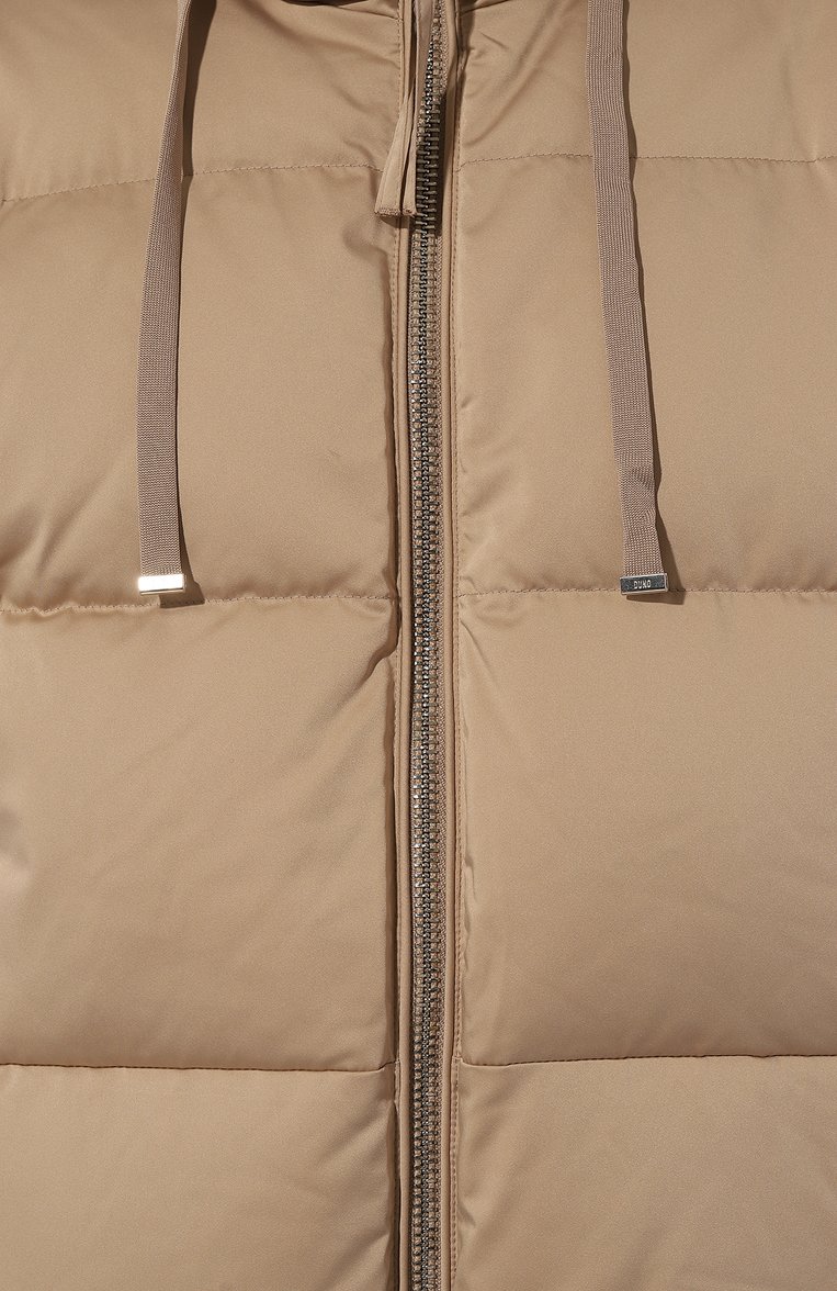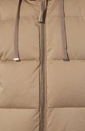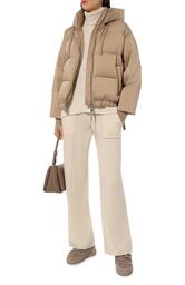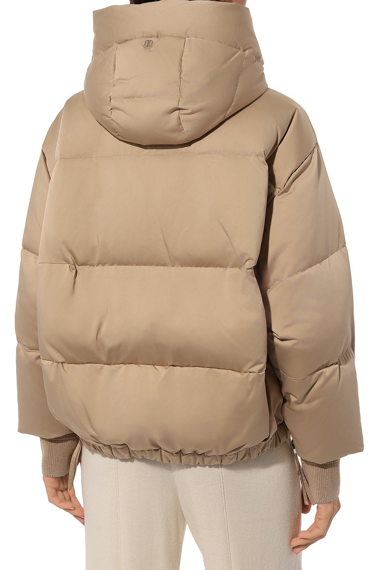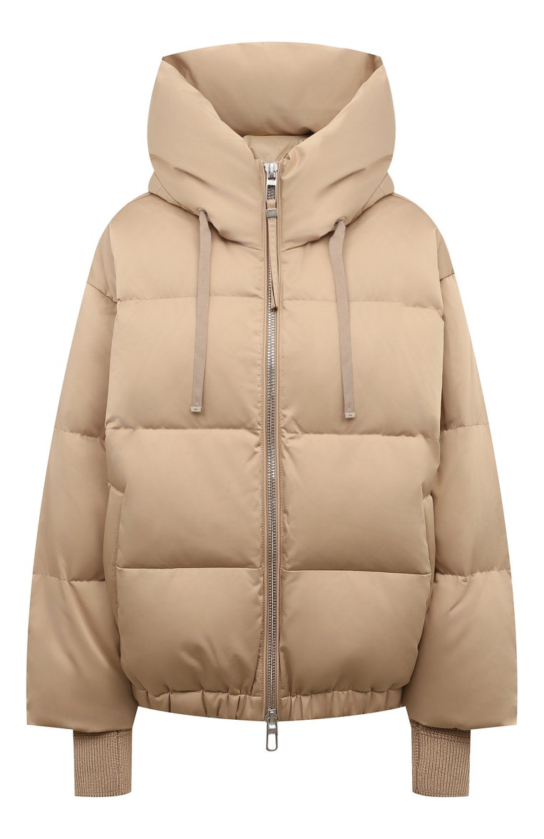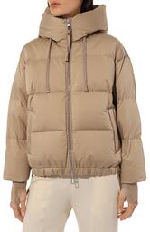 Укороченный пуховик силуэта oversize сшит из влагостойкого эластичного нейлона. Объемный капюшон украшен эмблемой марки. На рукавах — трикотажные манжеты-митенки. Куртка на утином пуху дополнена двумя карманами.