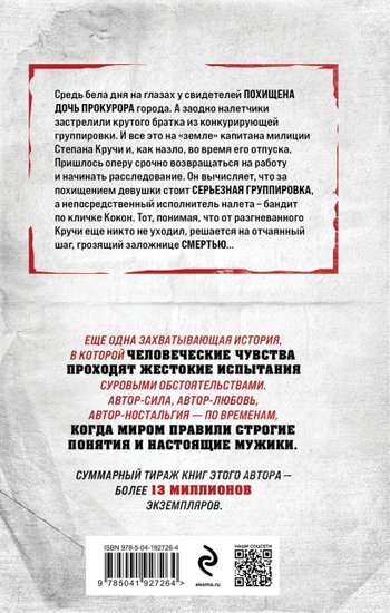 Средь бела дня на глазах у свидетелей похищена дочь прокурора города. А заодно налетчики застрелили крутого братка из конкурирующей группировки. И все это на «земле» капитана милиции Степана Кручи и, как назло, во время его отпуска. Пришлось оперу срочно возвращаться на работу и начинать расследование.Он вычисляет, что за похищением девушки стоит серьезная группировка, а непосредственный исполнитель налета — бандит по кличке Кокон. Тот, понимая, что от разгневанного Кручи еще никто не уходил, решается на отчаянный шаг, грозящий заложнице смертью…Еще одна захватывающая история, в которой человеческие чувства проходят жестокие испытания суровыми обстоятельствами. Автор-сила, автор-любовь, автор-ностальгия — по временам, когда миром правили строгие понятия и настоящие мужики.Суммарный тираж книг этого автора — более 13 миллионов экземпляров.Средь бела дня на глазах у свидетелей похищена дочь прокурора города. А заодно налетчики застрелили крутого братка из конкурирующей группировки. И все это на «земле» капитана милиции Степана Кручи и, как назло, во время его отпуска. Пришлось оперу срочно возвращаться на работу и начинать расследование.Он вычисляет, что за похищением девушки стоит серьезная группировка, а непосредственный исполнитель налета — бандит по кличке Кокон. Тот, понимая, что от разгневанного Кручи еще никто не уходил, решается на отчаянный шаг, грозящий заложнице смертью…Еще одна захватывающая история, в которой человеческие чувства проходят жестокие испытания суровыми обстоятельствами. Автор-сила, автор-любовь, автор-ностальгия — по временам, когда миром правили строгие понятия и настоящие мужики.Суммарный тираж книг этого автора — более 13 миллионов экземпляров.