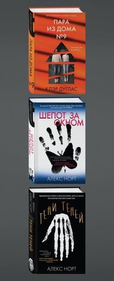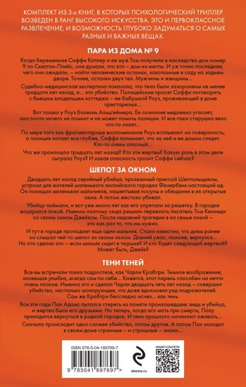 - Комплект из 3-х книг, в которых психологический триллер возведен в ранг высокого искусства. Это и первоклассное развлечение, и возможность глубоко задуматься о самых разных и важных вещах.Пара из дома номер 9.Когда беременная Саффи Катлер и ее муж Том получили в наследство дом номер 9 по Скелтон-Плейс, они думали, что это — дом их мечты. И уж точно последнее, чего они ожидали — найти человеческие останки, закопанные в саду на заднем дворе. Точнее, останки двух тел. Мужчины и женщины…Судебно-медицинская экспертиза показала, что тела были захоронены не менее тридцати лет назад, и… это убийство. Полицейские просят Саффи поговорить с бывшим владельцем коттеджа — ее бабушкой Роуз, проживающей в доме престарелых…Вот только у Роуз болезнь Альцгеймера. Ее сознание медленно угасает, она почти ничего не помнит и не может помочь полиции. И все-таки старушка явно что-то знает…По мере того, как фрагментарные воспоминания Роуз всплывают на поверхность, а полиция копает все глубже, Саффи понимает, что за ней и ее домом следят. Кто-то очень опасный…Что же произошло тридцать лет назад? Кто эти жертвы? Какую роль в этом деле сыграла Роуз? И какая опасность грозит Саффи сейчас?Шепот за окномДвадцать лет назад серийный убийца, прозванный прессой Шептальщиком, устроил для жителей маленького английского городка Фезербэнк настоящий ад. Он похищал маленьких мальчиков, нашептывая посулы и обещания в их открытые окна. А потом жестоко убивал.Убийцу поймали, и вот уже много лет как его упрятали за решетку. В городке воцарился покой. Именно поэтому сюда решили переехать писатель Том Кеннеди со своим сыном Джейком. После недавней трагедии в их семье, покой — это как раз то, что им нужно.И тут в городе пропадает еще один мальчик. Стало известно, что днем ранее он слышал чей-то шепот за своим окном. Давний ужас, похоже, вернулся… Но кто сделал это — если маньяк сидит в тюрьме? И кто будет следующей жертвой? Может быть, Джейк?Тени тенейВсе вы встречали таких подростков, как Чарли Крабтри. Темное воображение, зловещая улыбка, всегда сам по себе… Кажется, этот парень способен на нечто очень плохое. Именно это и сделал Чарли двадцать пять лет назад — совершил убийство, настолько шокирующее, что даже вдохновил ряд подражателей. Сам же Крабтри бесследно исчез… как тень.Все эти годы Пол Адамс пытался стереть из памяти произошедшее: ведь и убийца, и жертва были его друзьями. Но теперь, когда его мать при смерти, Полу приходится вернуться в родной городок. И тени прошлого начинают оживать…Сначала происходит одно схожее убийство, потом другое. А потом Пол находит в своем доме странные — и страшные — знаки… Комплект из 3-х книг, в которых психологический триллер возведен в ранг высокого искусства. Это и первоклассное развлечение, и возможность глубоко задуматься о самых разных и важных вещах.Пара из дома номер 9.Когда беременная Саффи Катлер и ее муж Том получили в наследство дом номер 9 по Скелтон-Плейс, они думали, что это — дом их мечты. И уж точно последнее, чего они ожидали — найти человеческие останки, закопанные в саду на заднем дворе. Точнее, останки двух тел. Мужчины и женщины…Судебно-медицинская экспертиза показала, что тела были захоронены не менее тридцати лет назад, и… это убийство. Полицейские просят Саффи поговорить с бывшим владельцем коттеджа — ее бабушко