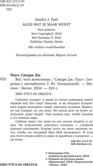 ✅ Книга "Все, чего пожелаешь" с твердой обложкой - это черный замок в черном мире, где исполняются все желания.✅ Саймону уже не первый месяц снится этот мир. Один голос зовет его войти в замок, другой предостерегает от этого шага.⚠️ Саймон не знает, что выбрать. Его младший брат Ной болен, и с каждым днем болезнь усиливается. Врачи не могут его вылечить. Может быть, черный замок исполнит желание и Ной выздоровеет? Но чем за это заплатит Саймон?✅ Автор книги, Сандра Дж. Паул, по образованию клинический психолог, поэтому цели и мотивы ее персонажей всегда тонко и достоверно прописаны.✅ Эта книга предлагает мистические приключения от автора, неоднократно номинированного на премии за свои триллеры!✅ Книга "Все, чего пожелаешь" с твердой обложкой - это черный замок в черном мире, где исполняются все желания.✅ Саймону уже не первый месяц снится этот мир. Один голос зовет его войти в замок, другой предостерегает от этого шага.⚠️ Саймон не знает, что выбрать. Его младший брат Ной болен, и с каждым днем болезнь усиливается. Врачи не могут его вылечить. Может быть, черный замок исполнит желание и Ной выздоровеет? Но чем за это заплатит Саймон?✅ Автор книги, Сандра Дж. Паул, по образованию клинический психолог, поэтому цели и мотивы ее персонажей всегда тонко и достоверно прописаны.✅ Эта книга предлагает мистические приключения от автора, неоднократно номинированного на премии за свои триллеры!