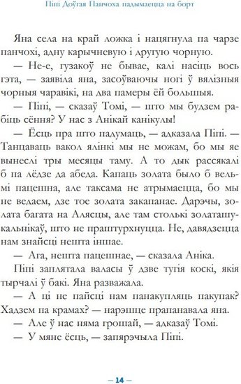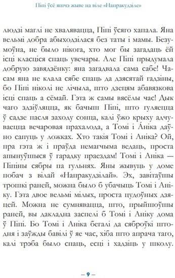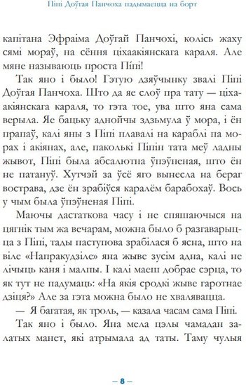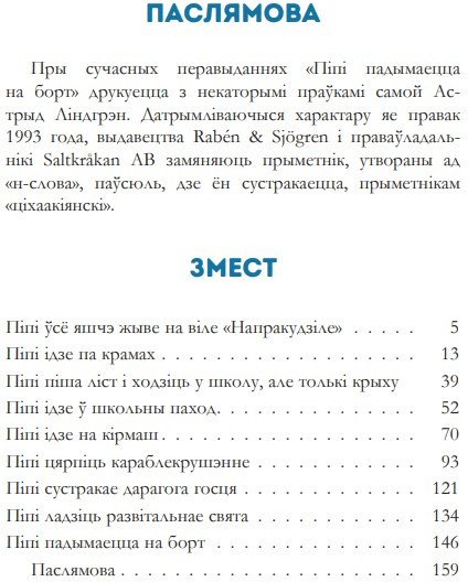 Пíпі Доўгая Панчоха — самая моцная, самая добрая, самая вясёлая і самая багатая дзяўчынка на свеце. Яна жыве зусім адна на віле “Напракудзіле”. У яе ёсць конь і малпачка — Спадар Нільсан. А яшчэ — чамадан, набіты залатымі манетамі.Томі і Аніка вельмі любяць бавіць час са сваёй сяброўкай, і вельмі рады, што яна нарэшце пачала хадзіць у школу (праўда, зусім крыху). Піпі ладзіць пікнікі і караблекрушэнні, купляе васямнаццаць кілаграм цукерак, уціхамірвае ўдава і нарэшце сустракаецца са сваім татам, які і праўда аказаўся ціхаакіянскім каралём.Гісторыя пра Піпі Доўгую Панчоху ўпершыню выйшла ў 1945 годзе, і з таго часу яе палюбілі некалькі пакаленняў дзяцей з розных краін.У 2020-м адзначалася 75-годдзе самай знакамітай дзяўчынкі на свеце. Да юбілею мы падрыхтавалі новыя пераклады дзвюх гісторый пра Піпі з класічнымі ілюстрацыямі Інгрыд Ванг Нюман.Пíпі Доўгая Панчоха — самая моцная, самая добрая, самая вясёлая і самая багатая дзяўчынка на свеце. Яна жыве зусім адна на віле “Напракудзіле”. У яе ёсць конь і малпачка — Спадар Нільсан. А яшчэ — чамадан, набіты залатымі манетамі.Томі і Аніка вельмі любяць бавіць час са сваёй сяброўкай, і вельмі рады, што яна нарэшце пачала хадзіць у школу (праўда, зусім крыху). Піпі ладзіць пікнікі і караблекрушэнні, купляе васямнаццаць кілаграм цукерак, уціхамірвае ўдава і нарэшце сустракаецца са сваім татам, які і праўда аказаўся ціхаакіянскім каралём.Гісторыя пра Піпі Доўгую Панчоху ўпершыню выйшла ў 1945 годзе, і з таго часу яе палюбілі некалькі пакаленняў дзяцей з розных краін.У 2020-м адзначалася 75-годдзе самай знакамітай дзяўчынкі на свеце. Да юбілею мы падрыхтавалі новыя пераклады дзвюх гісторый пра Піпі з класічнымі ілюстрацыямі Інгрыд Ванг Нюман.