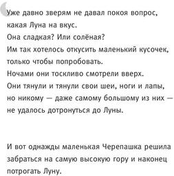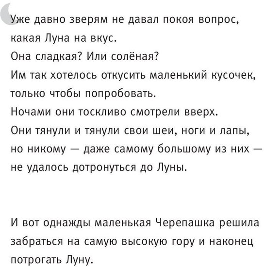 Кто из нас не хотел попробовать Луну на вкус? Вот и звери долго мечтали об этом, пока наконец Черепашке не пришла в голову замечательная идея: «Если ты встанешь мне на спину, то, возможно, мы дотянемся до Луны». Это добрая сказка о мечте, любопытстве и дружбе.Книга переведена на многие языки и стала классикой современной детской литературы. А завораживающими иллюстрациями будут очарованы и самые маленькие слушатели, и их родители.Кто из нас не хотел попробовать Луну на вкус? Вот и звери долго мечтали об этом, пока наконец Черепашке не пришла в голову замечательная идея: «Если ты встанешь мне на спину, то, возможно, мы дотянемся до Луны». Это добрая сказка о мечте, любопытстве и дружбе.Книга переведена на многие языки и стала классикой современной детской литературы. А завораживающими иллюстрациями будут очарованы и самые маленькие слушатели, и их родители.