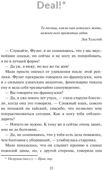 Мало, тридцатилетнего талантливого бизнес-стратега, командируют в Бангкок, чтобы спасти компанию, стоящую на грани банкротства. Через несколько недель после приезда он случайно слышит разговор, который повергает его в шок: жить ему осталось совсем недолго… В тот момент, когда Мало готов уже свести счеты с жизнью, откуда ни возьмись появляется странная старушка и предлагает заключить необычный договор на 30 дней. Она бросает ему вызов. Примет ли он этот вызов? Решится ли на необычный эксперимент, который, возможно, изменит его судьбу? Мало соглашается. И отправляется в удивительное путешествие, пропитанное вкусами и ароматами Таиланда, которое откроет ему глаза на многое.Мало, тридцатилетнего талантливого бизнес-стратега, командируют в Бангкок, чтобы спасти компанию, стоящую на грани банкротства. Через несколько недель после приезда он случайно слышит разговор, который повергает его в шок: жить ему осталось совсем недолго… В тот момент, когда Мало готов уже свести счеты с жизнью, откуда ни возьмись появляется странная старушка и предлагает заключить необычный договор на 30 дней. Она бросает ему вызов. Примет ли он этот вызов? Решится ли на необычный эксперимент, который, возможно, изменит его судьбу? Мало соглашается. И отправляется в удивительное путешествие, пропитанное вкусами и ароматами Таиланда, которое откроет ему глаза на многое.