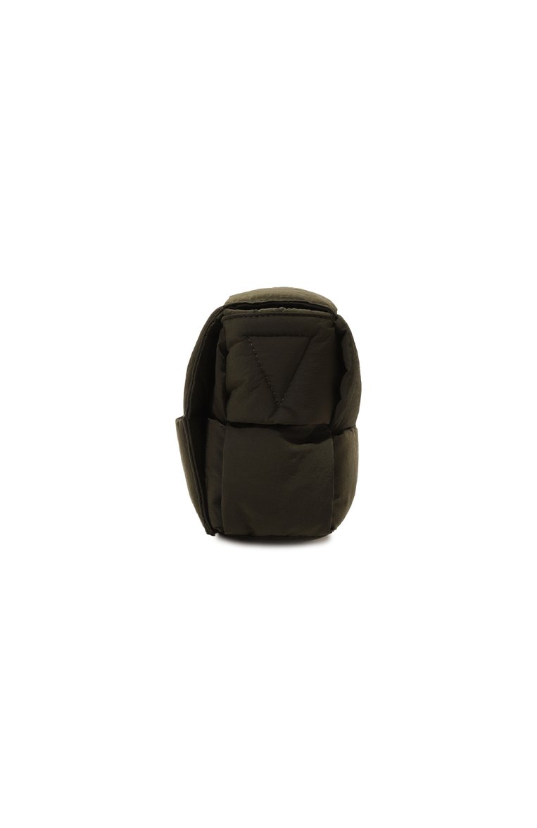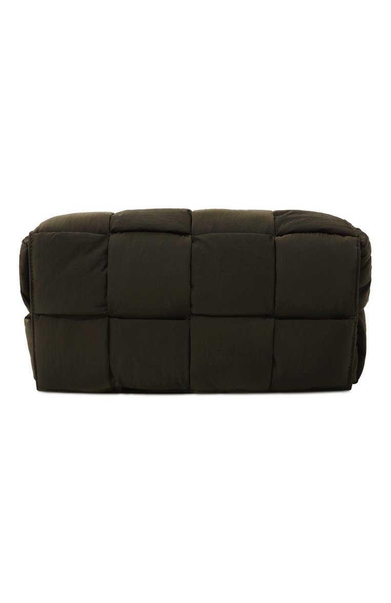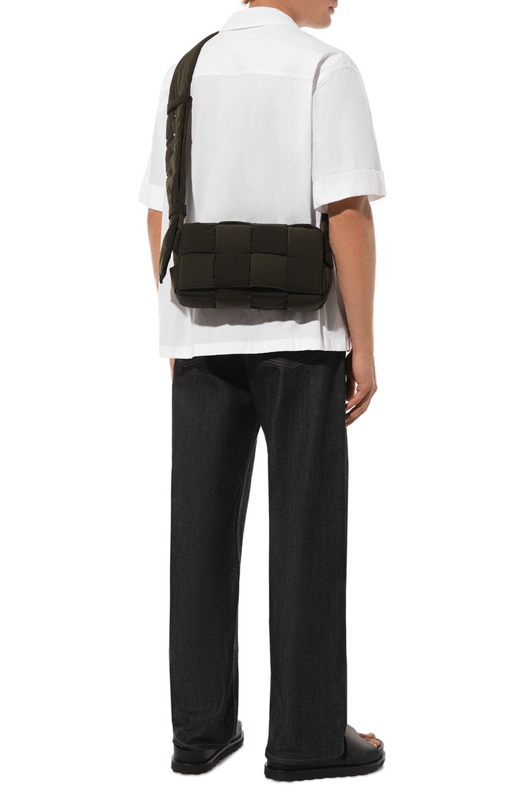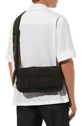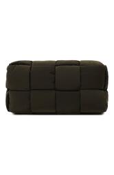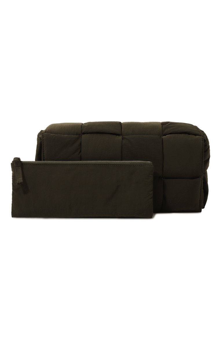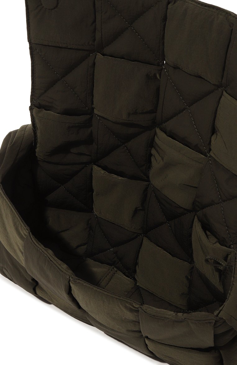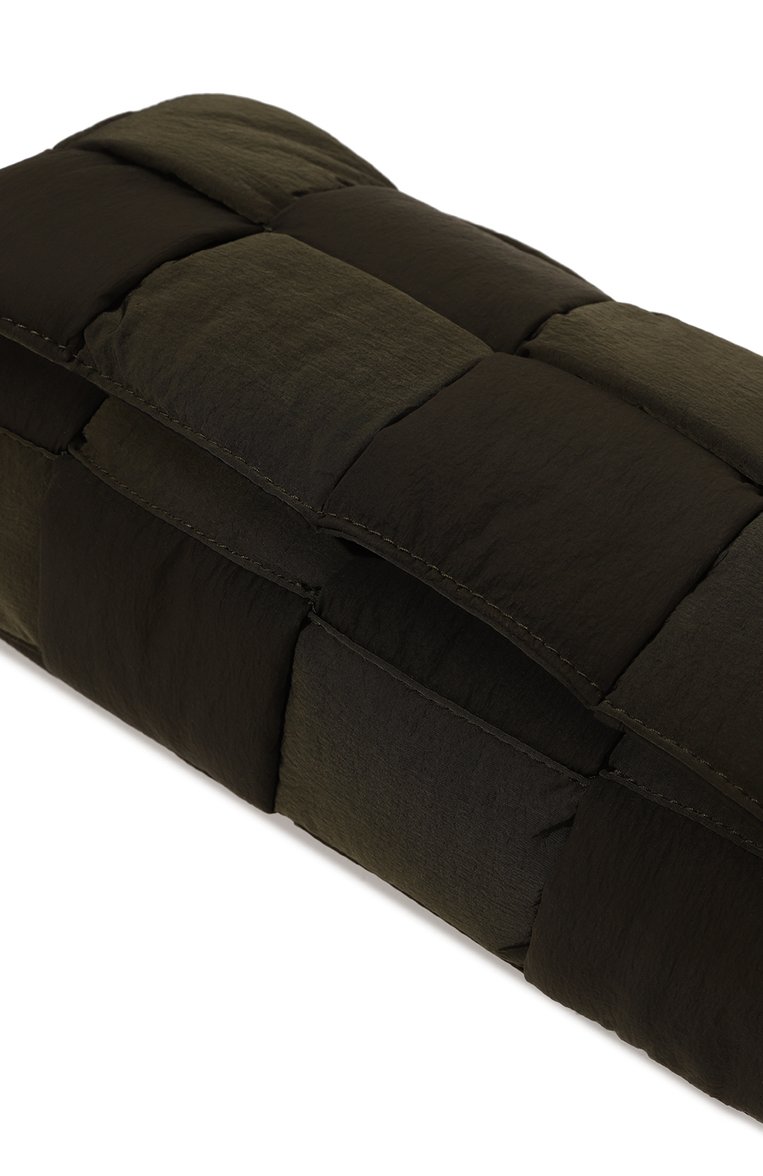 Сумку Tech Cassette оттенка Camping сплели в технике intreccio. Для изготовления использовали широкие объемные ленты из прочного нейлона. Из него же выполнили плечевой ремень и входящую в комплект косметичку на молнии. Внутрь поместятся смартфон, портмоне, ключи.