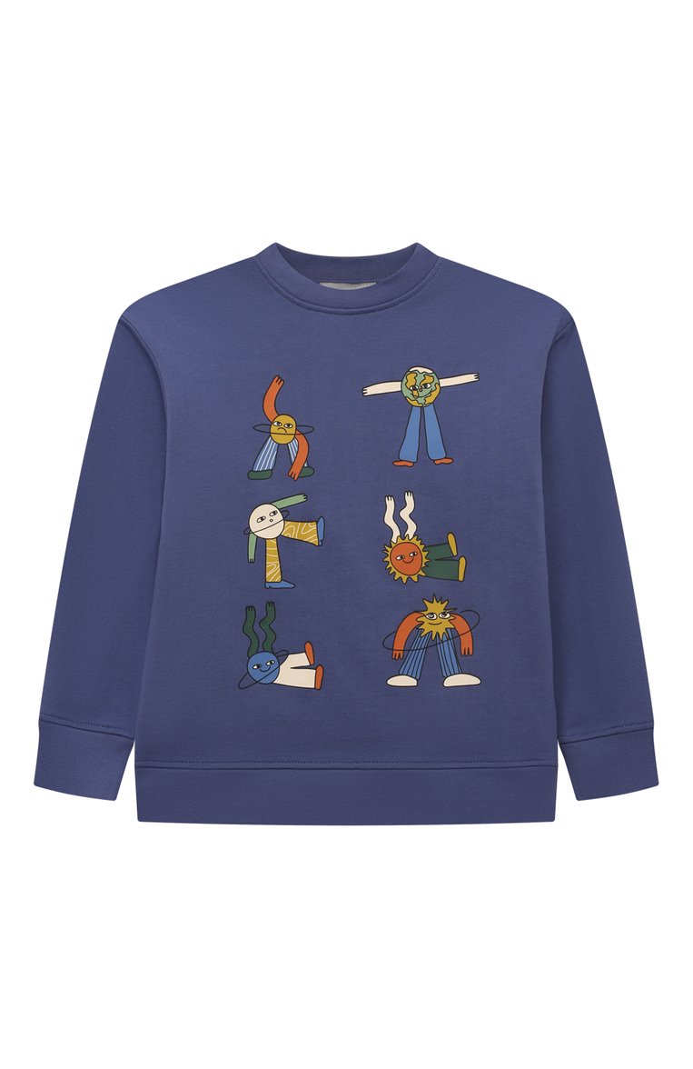 Для пошива свитшота с круглой горловиной использовали мягкий трикотаж из органического хлопка, сертифицированного GOTS. Модель прямого кроя украсили спереди графичным разноцветным принтом Cosmic Cowboy.