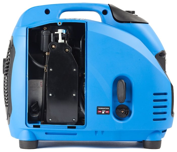 однофазный (220 вольт) мощность 1.80 кВт, максимальная 2 кВт ручной запуск воздушное охлаждение 1 розетка 12В, 2 розетки 220В