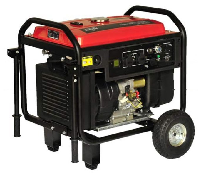 однофазный (220 вольт) мощность 6.50 кВт, максимальная 7 кВт электрический запуск воздушное охлаждение 1 розетка 12В, 2 розетки 220В колёса вес 72 кг