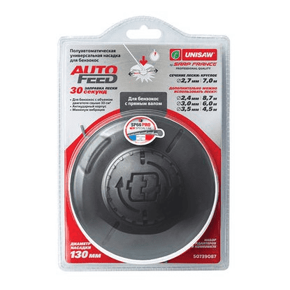 Насадка универсальная AUTOFEED 130 мм Professional Quality Unisaw 50739087 устанавливается на мотокосы с прямым валом и объемом двигателя от 33 см³.