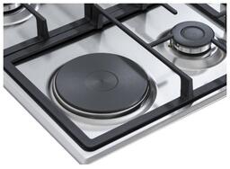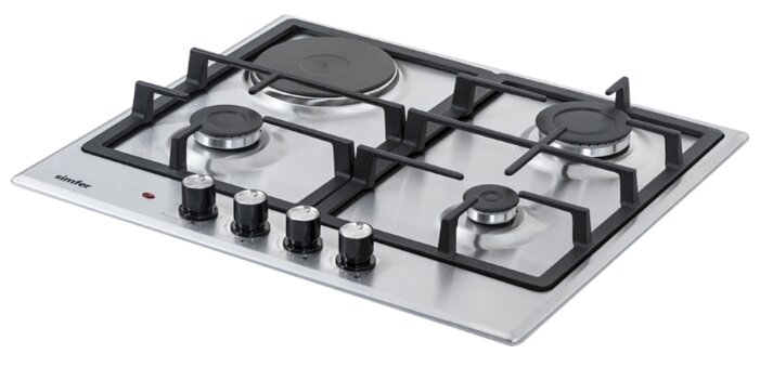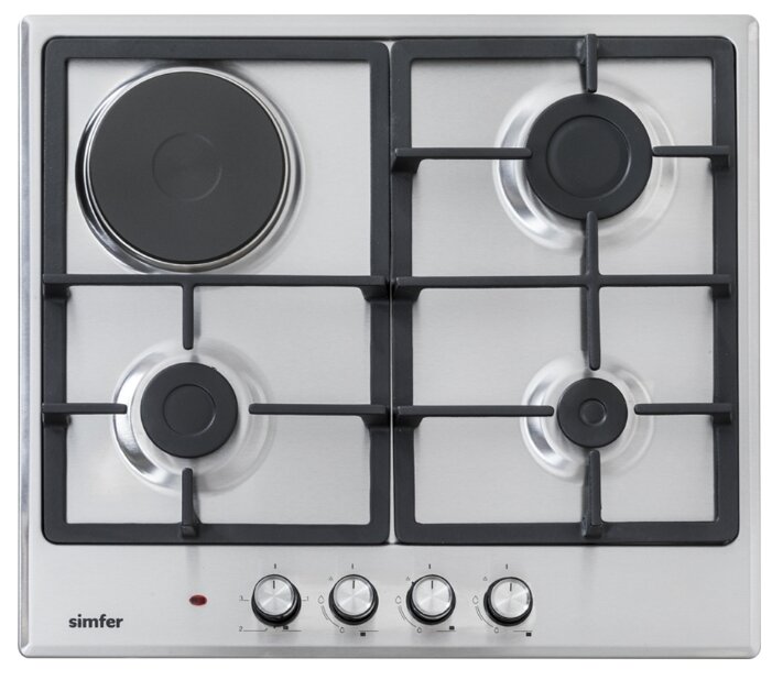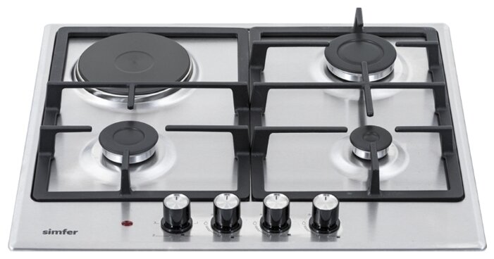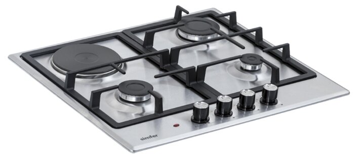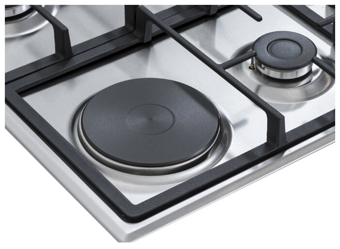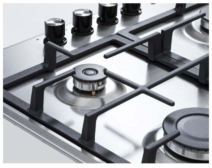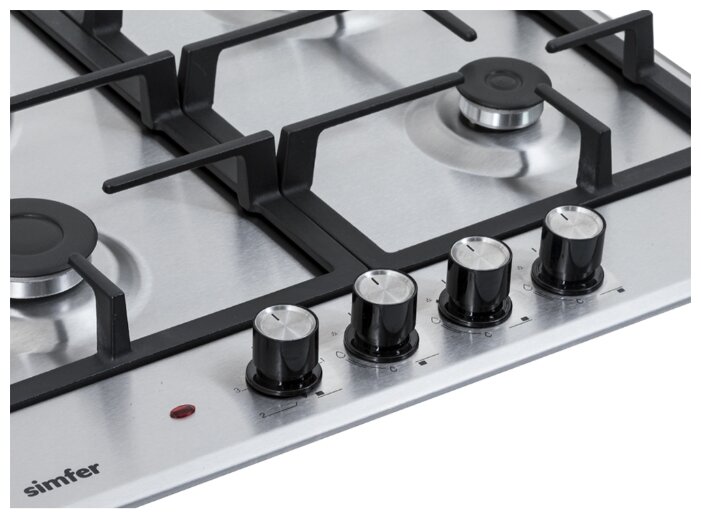 Поверхность из нержавеющей стали 4 конфорки Независимая установка Электроподжиг Газ-контроль Чугунные решетки Поворотные переключатели ШхГ: 59х52 см
