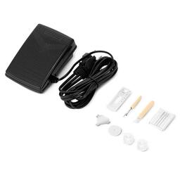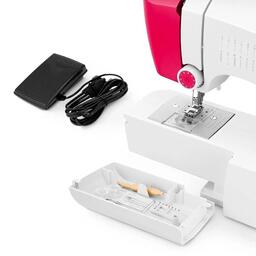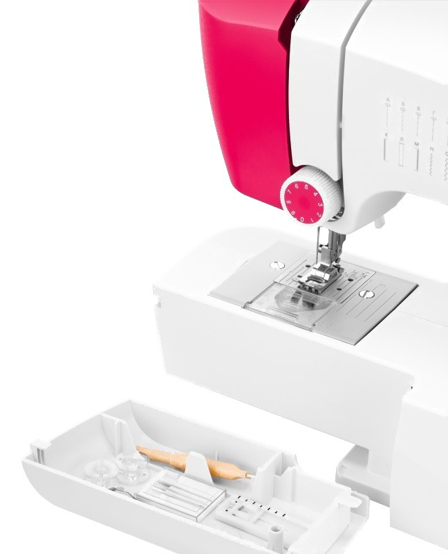 • Дополнительная комплектация подсветка рабочей зоны, комплект игл (3 шт. №90/14), шпулька (3 шт.), подкладка (войлочная), отвертка, вспарыватель, щеточка, педаль (шнур 1.2 м), сетевой шнур (1.9 м), инструкция