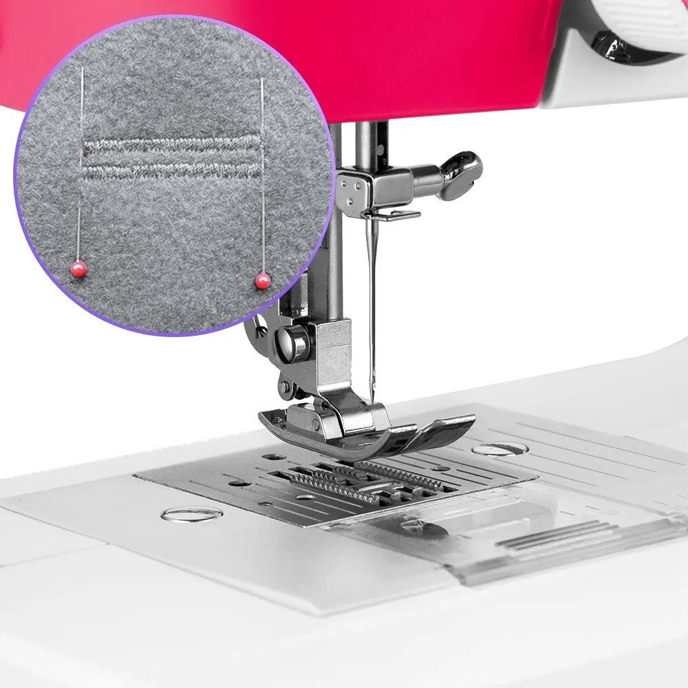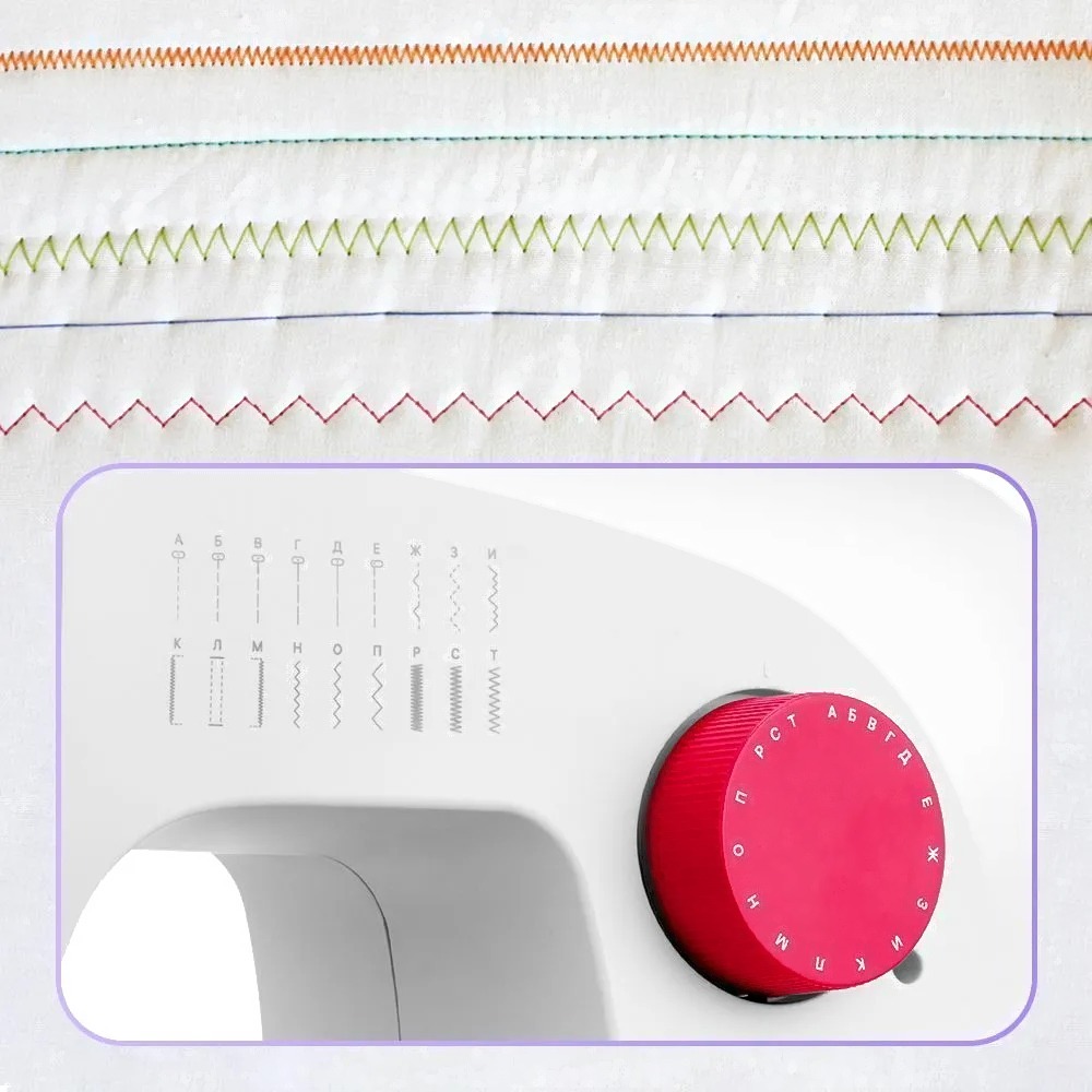 • Строчки прямая, потайная, петля-полуавтомат, эластичная потайная, эластичный зигзаг, зигзаг, атласная, пуговичная, декоративная