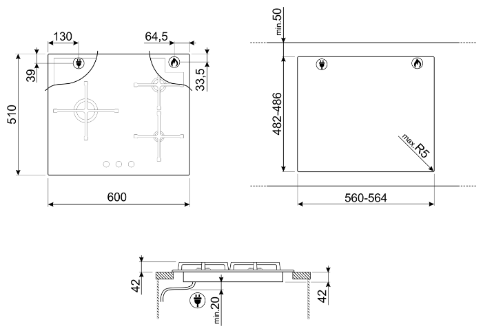 поверхность из закаленного стекла 3 конфорки независимая установка электроподжиг газ-контроль чугунные решетки поворотные переключатели ШхГ: 60х51 см