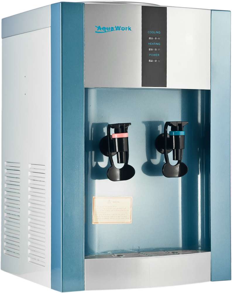 Настольный кулер для воды Aqua Work. С нагревом и компрессорным охлаждением. Потребляемая мощность 790 Вт. Тип установленных кранов: Нажим кружкой. Без защиты от ошпаривания. Цвет: Серебро.