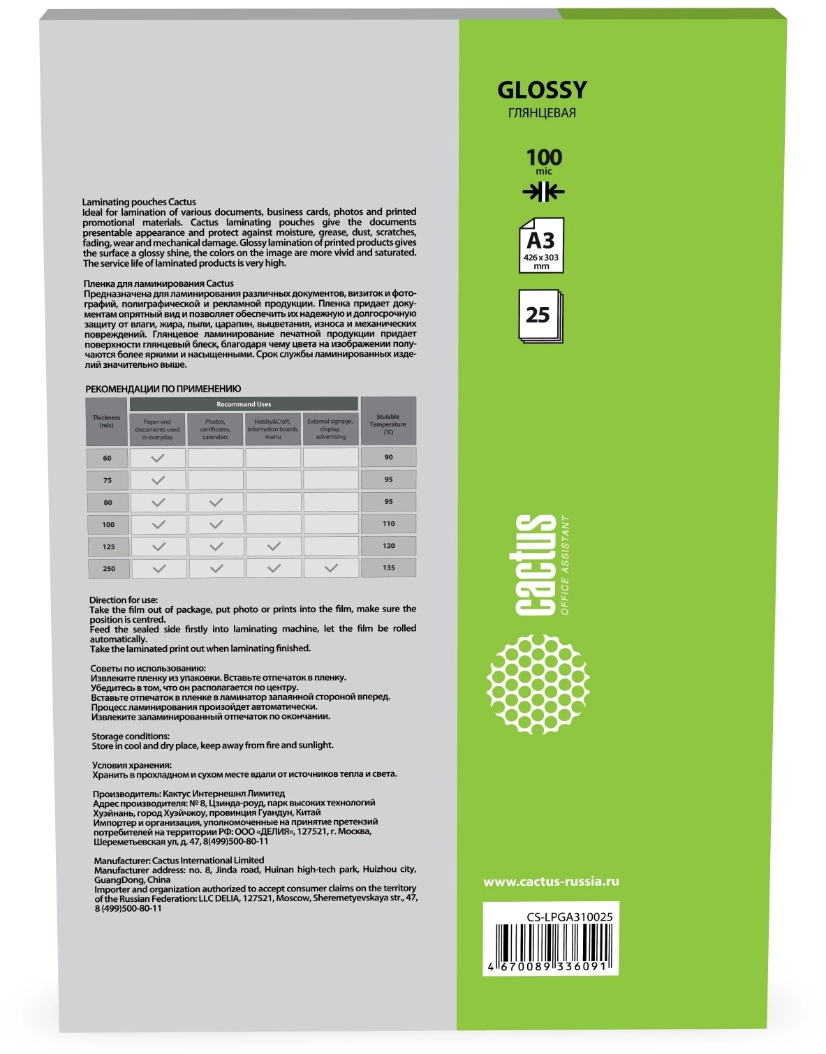 Пленка для ламинирования Cactus 100мкм A3 (25шт) глянцевая 426x303мм CS-LPGA310025