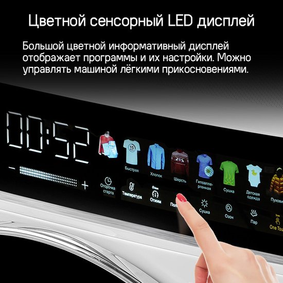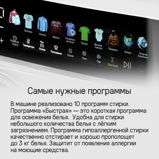 ✅ Современный инверторный двигатель обеспечивает отличную энергоэффективность и минимальный уровень шума всего 62 дБ.✅ Автобалансировка загрузки равномерно распределяет белье в барабане, что гарантирует низкий уровень шума при отжиме даже на максимальных оборотах.✅ Загрузка до 9 килограммов позволяет стирать всю необходимую одежду за один цикл, что экономит ваше время и электроэнергию.✅ Сенсорное управление интуитивно понятно: выберите программу с помощью поворотной ручки, а нужные параметры — одним прикосновением.✅ 10 режимов стирки предлагают разнообразные алгоритмы, чтобы вы могли выбрать именно то, что нужно.✅ Разнообразные режимы для более эффективной стирки: "One Touch", "Пар", "Озон".⚠️ Защита от детей — система безопасности, которая блокирует панель управления, чтобы предотвратить случайное включение стиральной машины.✅ Современный инверторный двигатель обеспечивает отличную энергоэффективность и минимальный уровень шума всего 62 дБ.✅ Автобалансировка загрузки равномерно распределяет белье в барабане, что гарантирует низкий уровень шума при отжиме даже на максимальных оборотах.✅ Загрузка до 9 килограммов позволяет стирать всю необходимую одежду за один цикл, что экономит ваше время и электроэнергию.✅ Сенсорное управление интуитивно понятно: выберите программу с помощью поворотной ручки, а нужные параметры — одним прикосновением.✅ 10 режимов стирки предлагают разнообразные алгоритмы, чтобы вы могли выбрать именно то, что нужно.✅ Разнообразные режимы для более эффективной стирки: "One Touch", "Пар", "Озон".⚠️ Защита от детей — система безопасности, которая блокирует панель управления, чтобы предотвратить случайное включение стиральной машины.
