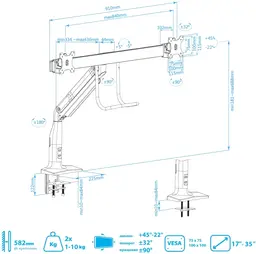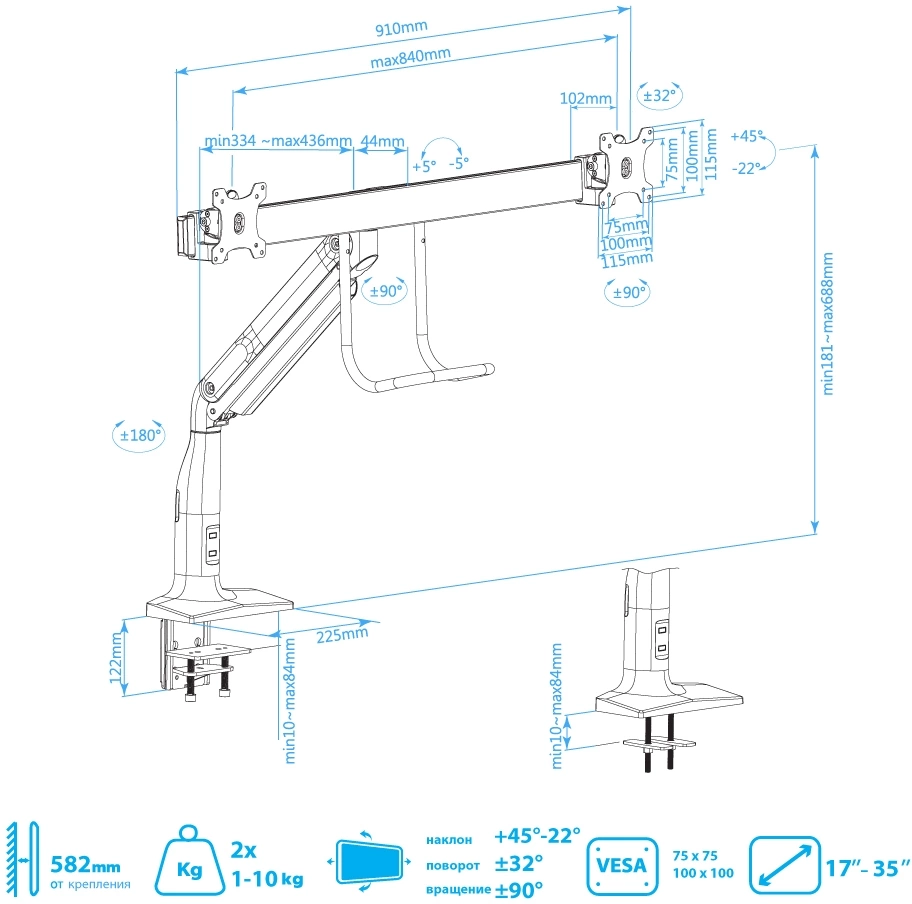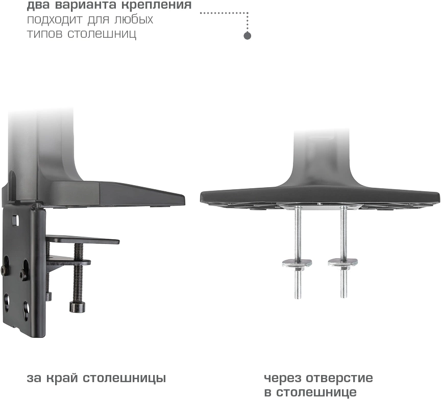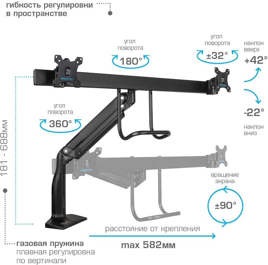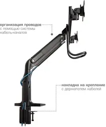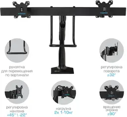 ОсобенностиНадежная стальная конструкция, Многофункциональный – мониторы на кронштейне можно поворачивать вокруг совей оси на 360°, наклонять вверх и вниз, придвигать или удалять от себя, Регулируемое положение по высоте, максимальная высота 688 мм, Кабель-каналы для укладки соединительных кабелей