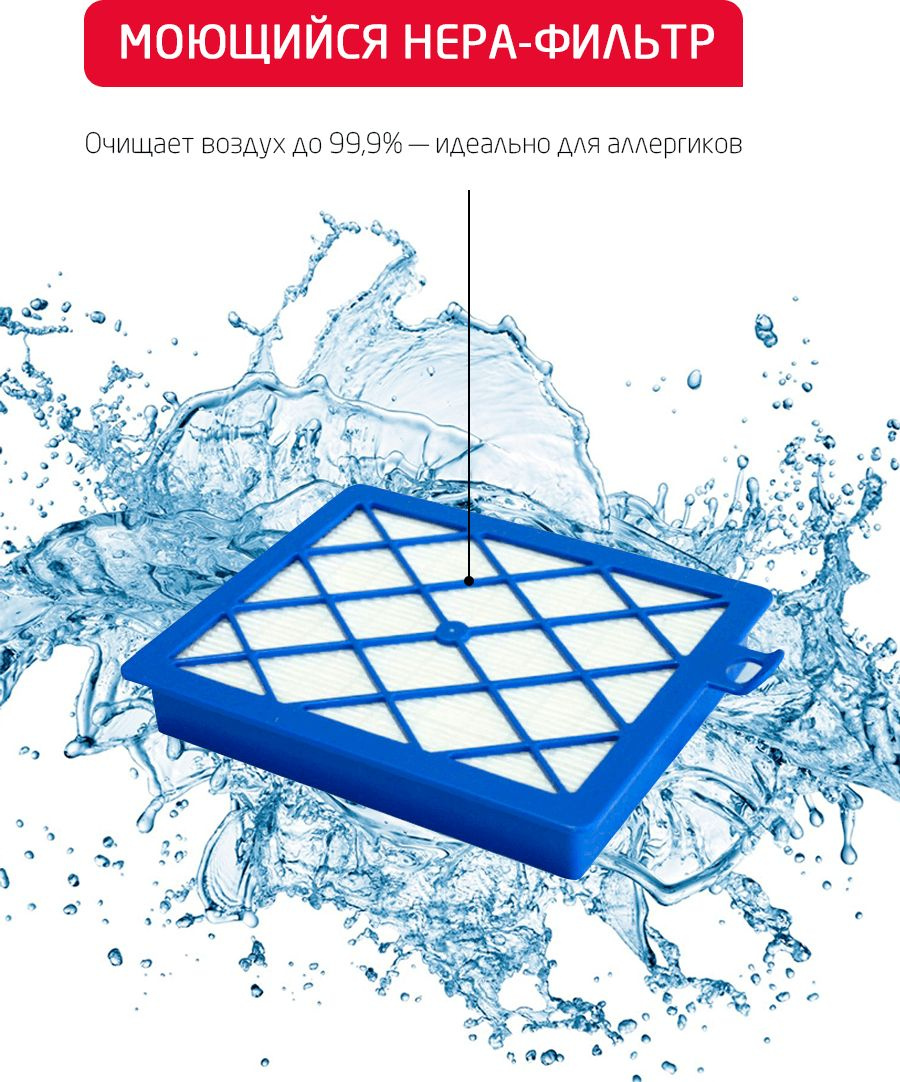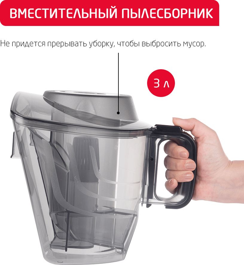 Другие насадки и принадлежностиТелескопическая труба 58-92 см., шланг для сухой уборки стандартный с дистанционным управлением на ручке, крепление для аксессуаров, моющийся HEPA-13 фильтр, моторный фильтр, поролоновый микрофильтр, LED Дисплей, батарейки в комплекте: ААА - 2 шт.