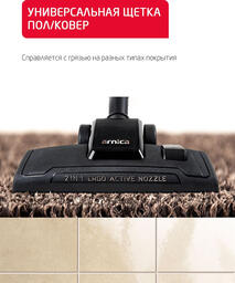 Насадки в комплектеНасадка 2 in 1 Ergo Active Nozzle (раньше была Super Air Flow Brush), турбо-щётка для глубокой очистки ковровых покрытий, удлиненная щелевая насадка, насадка для чистки текстиля и тканевых обивок мебели(прямоугольная), круглая насадка для мебели с мягким ворсом.