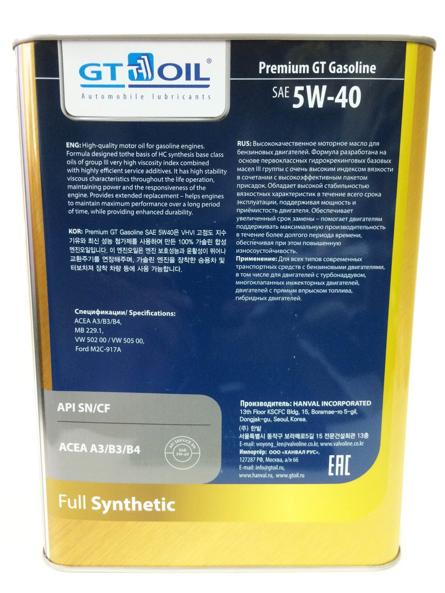 Масло моторное Premium GT Gasoline 5W-40 API SN/CF 4 л