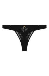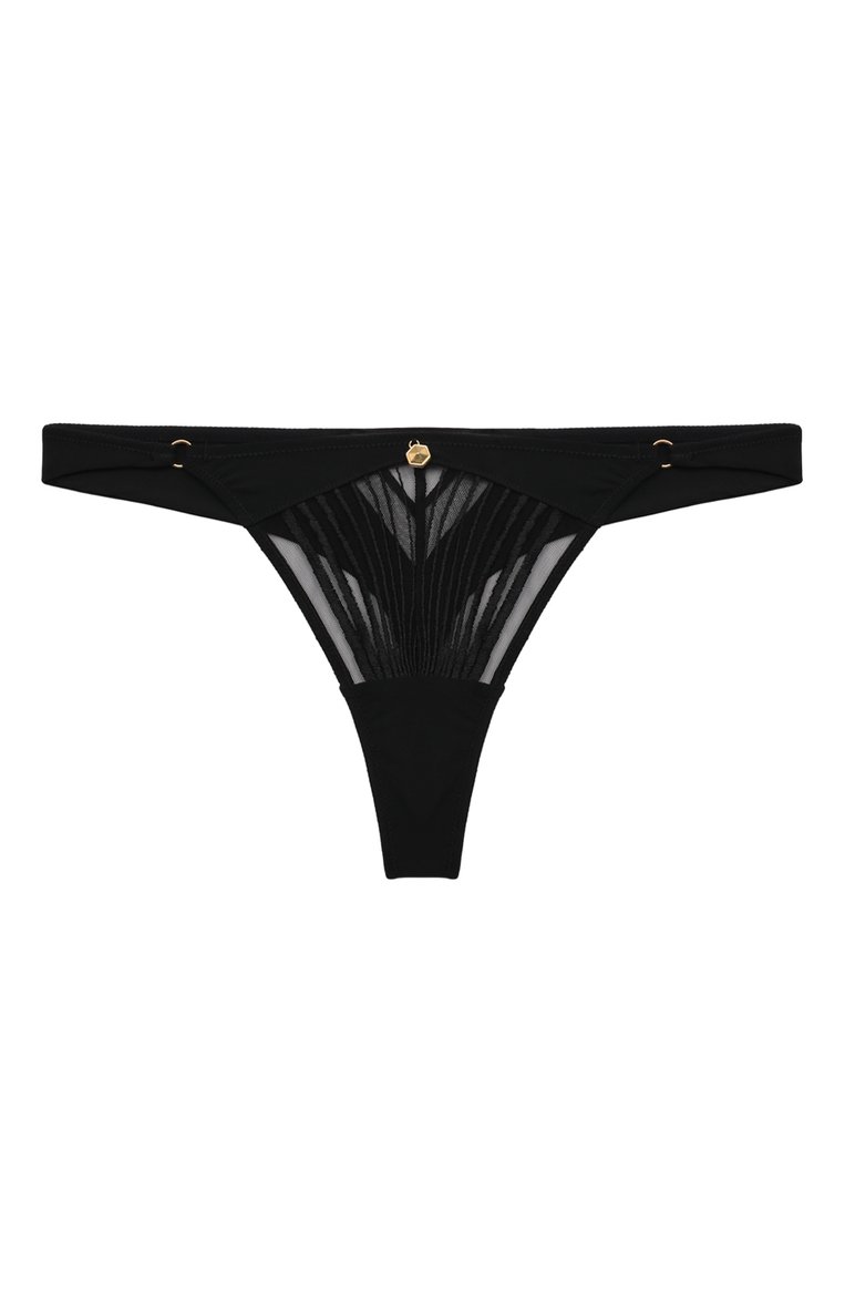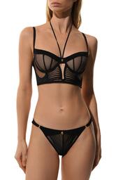 Трусы-танга из коллекции Sumptuous Waves, созданной с топ-моделью Синди Бруна, выполнили из тюля с геометрической вышивкой и плотного стрейчевого материала. Спереди белье украсили вставками-кольцами и подвеской, а сзади — треугольным вырезом и перемычкой с брендированной пластиной.