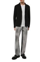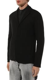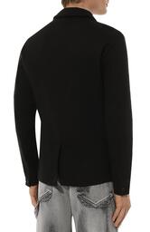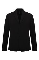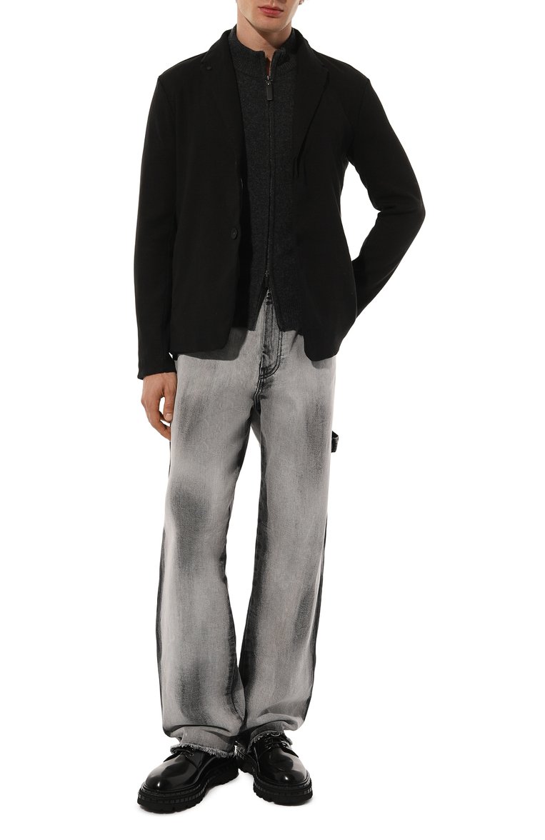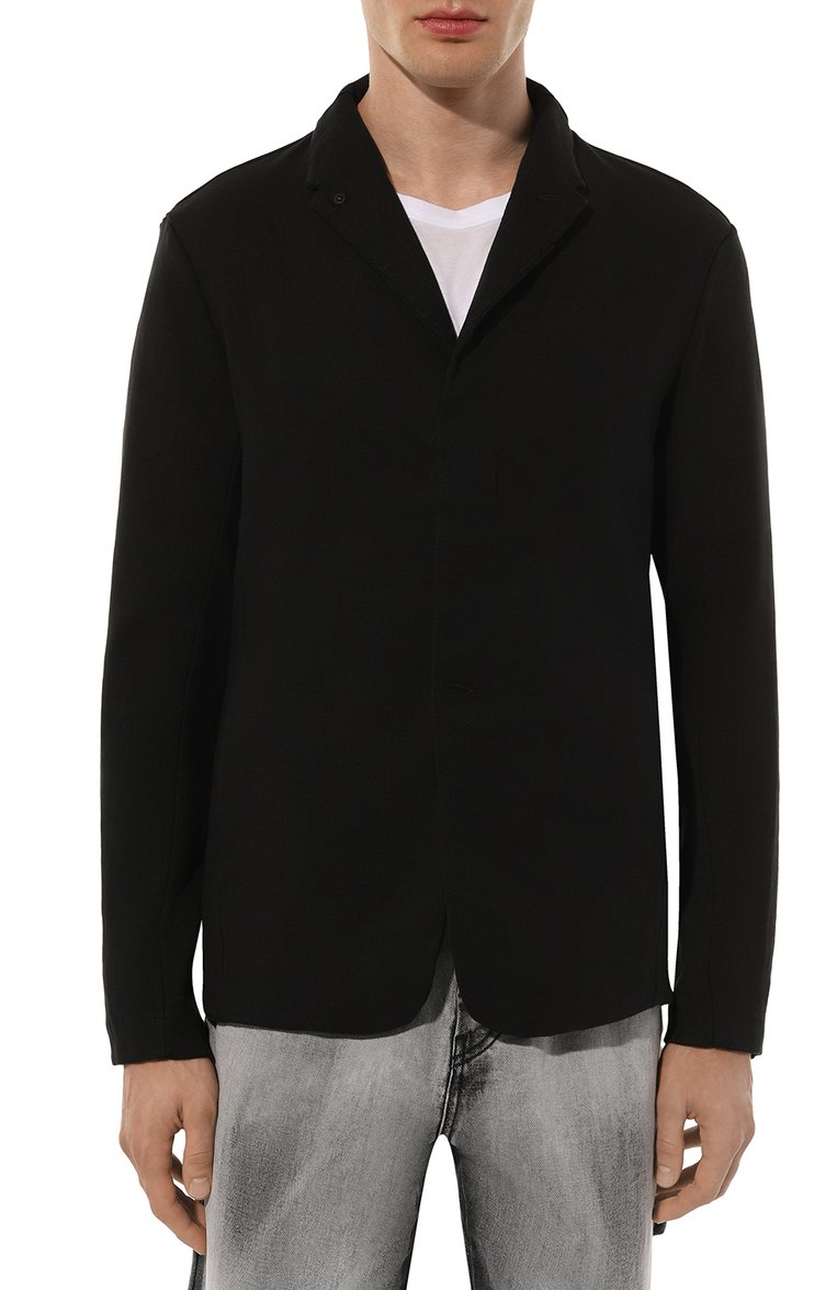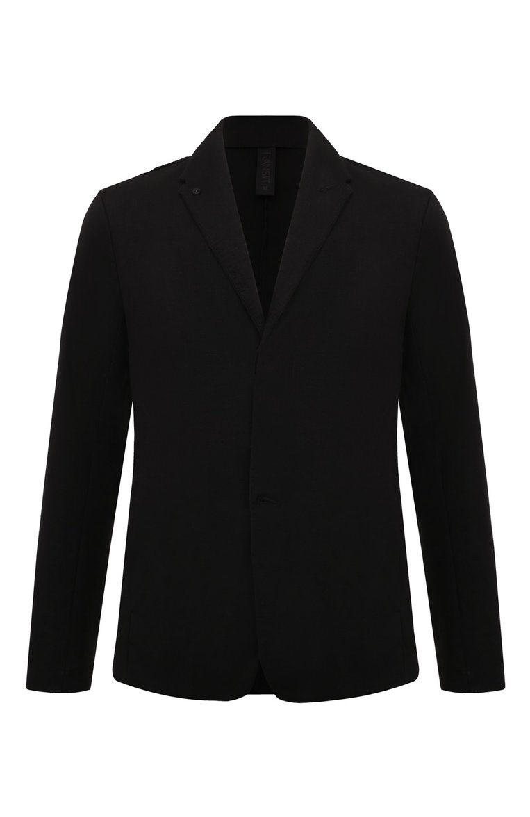 Однобортный пиджак кроя regular fit сшили из стрейчевого трикотина на основе шерсти первого пострига, органического хлопка и конопляных волокон. Модель со шлевкой сзади, потайной верхней пуговицей и пуговицей на лацкане дополнили прорезными боковыми и внутренним карманами.