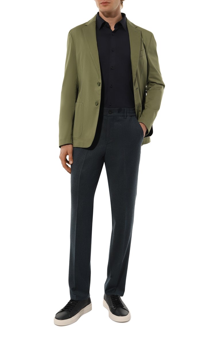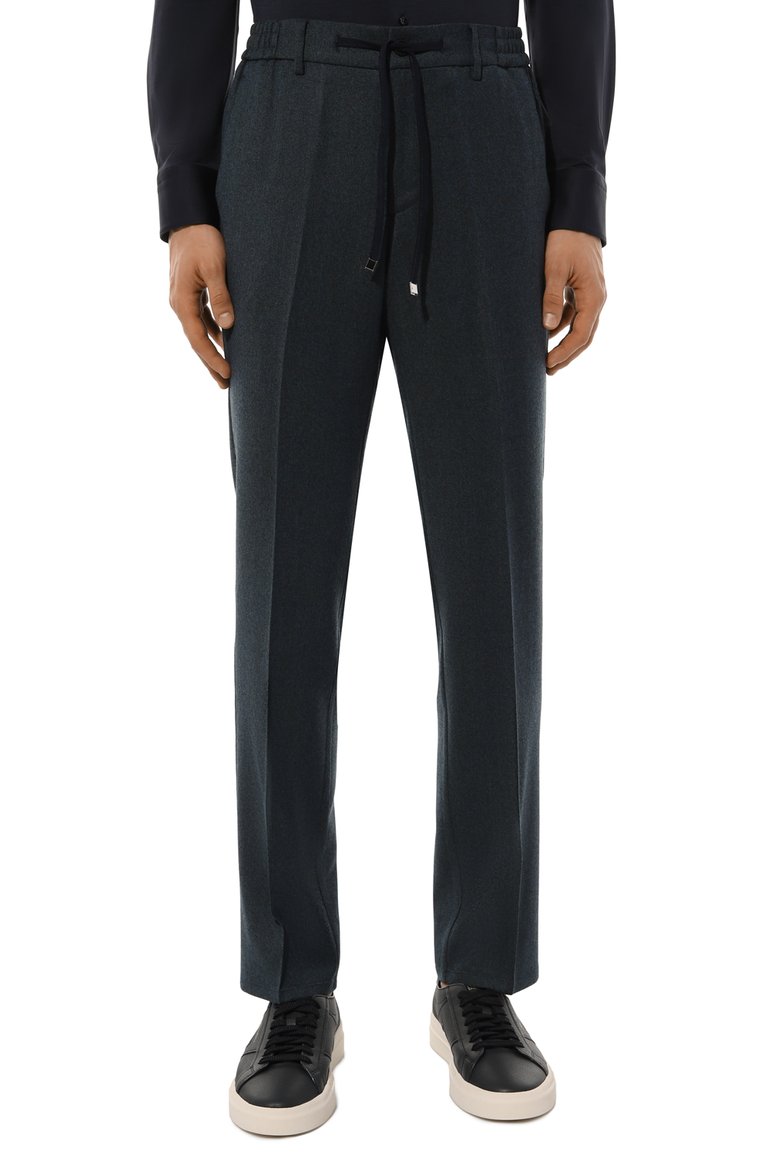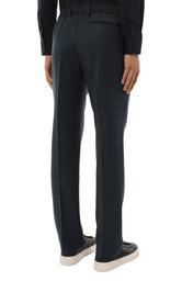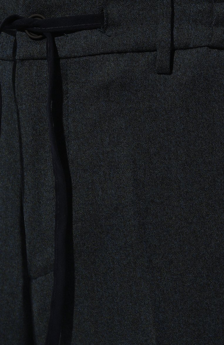 Для пошива брюк классического кроя использовали чистую шерсть. Модель со стрелками дополнили эластичным поясом-кулиской, парой прорезных карманов в боковых швах и одним карманом сзади.