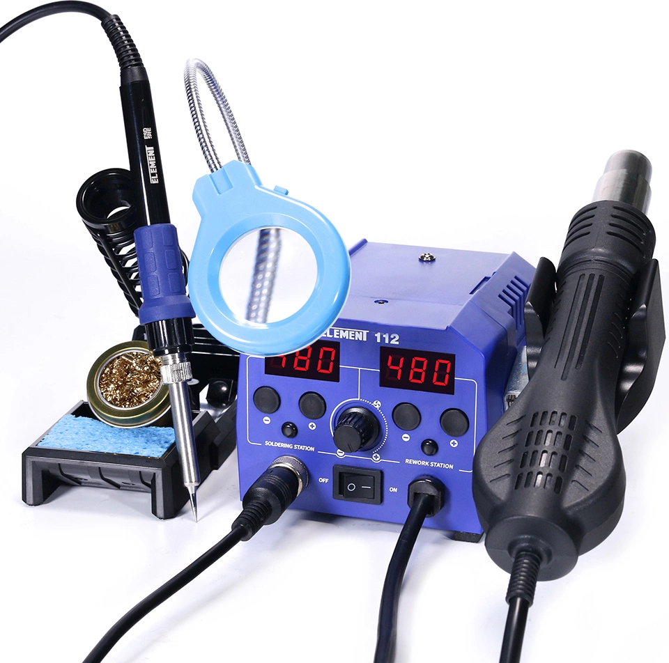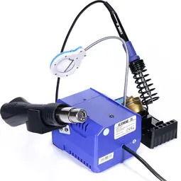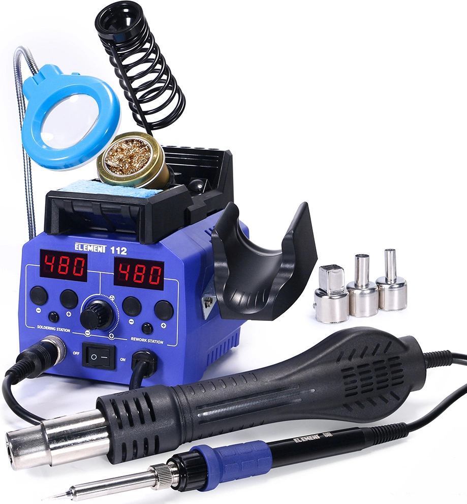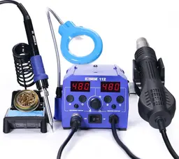 КомплектацияПаяльная станция с термофеном, сопло - 3 шт., паяльник с держателем, лупа с подсветкой, инструкция по эксплуатации.